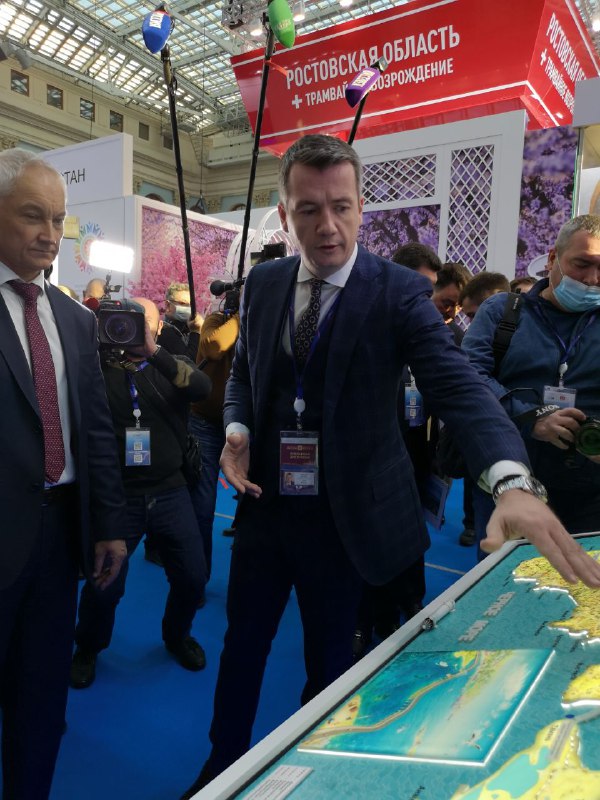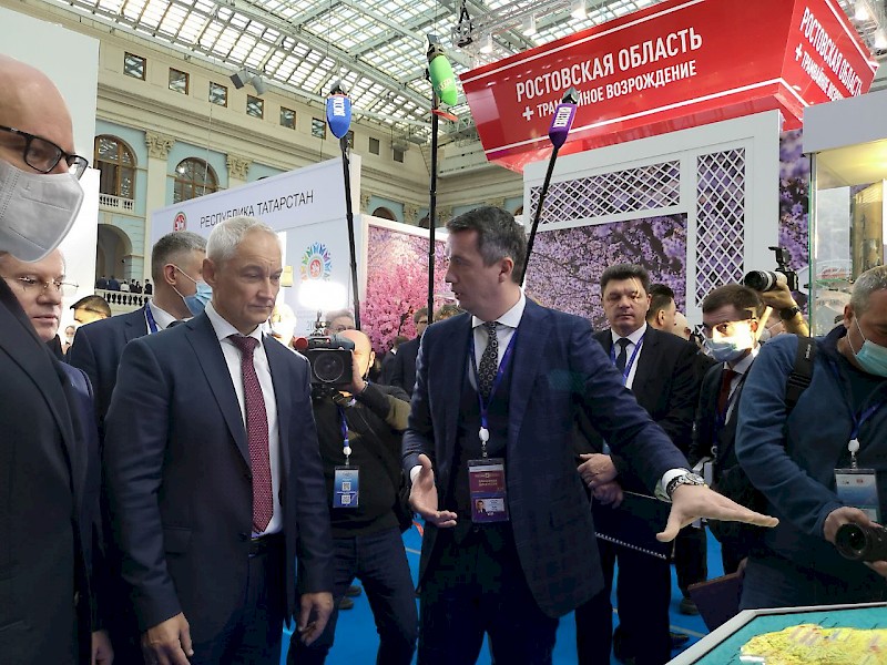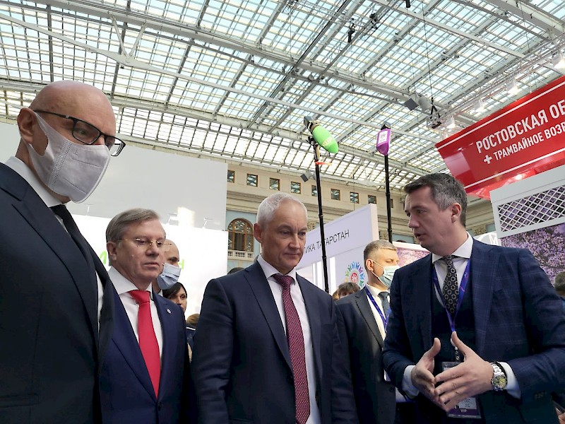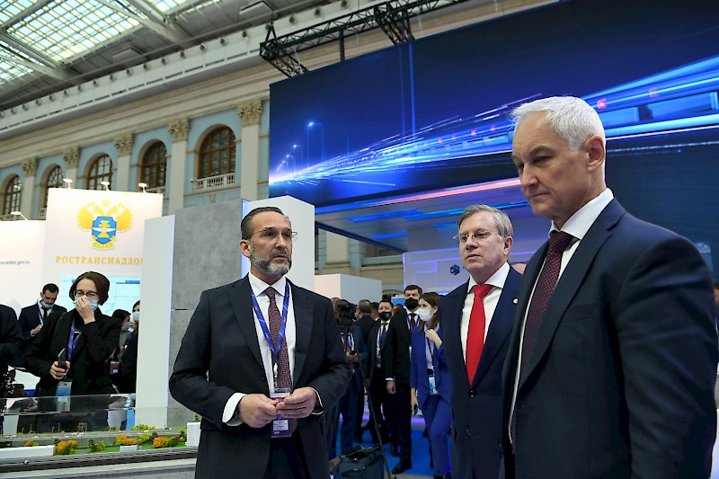 В ходе экскурсии по выставке руководитель Федерального агентства железнодорожного транспорта РФ Игорь Коваль ознакомил Первого заместителя председателя правительства Российской Федерации Андрея Белоусова с научными разработками молодых ученых железнодорожных вузов.