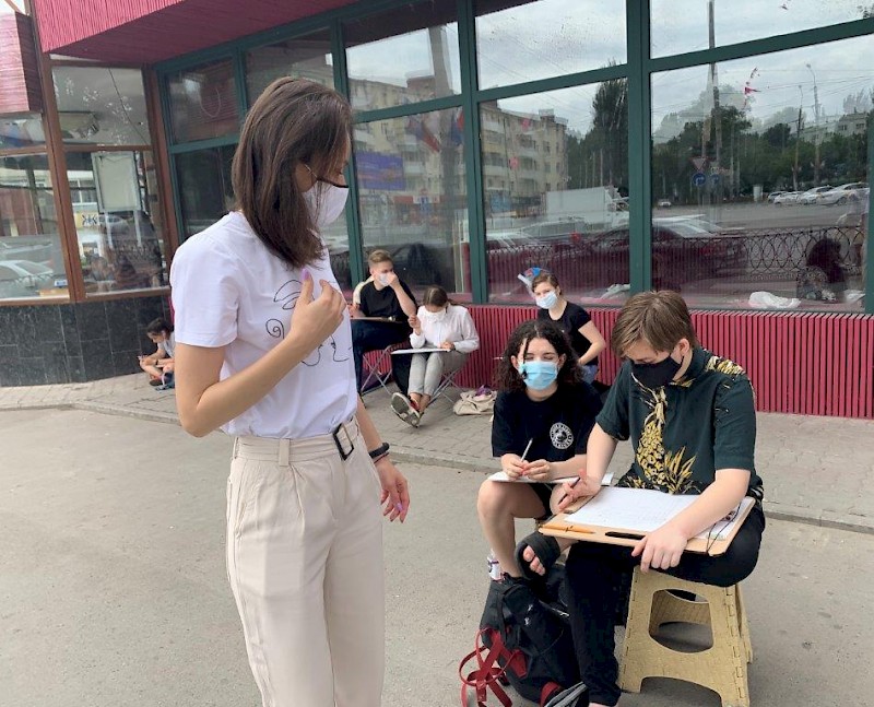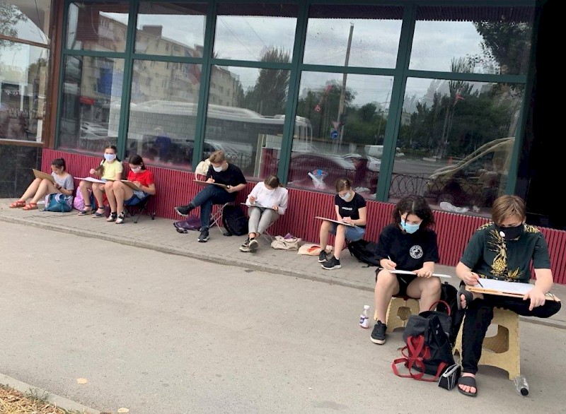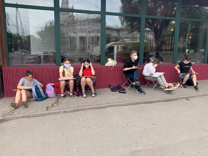 Учащиеся детской архитектурно-художественной школы ЮФУ под руководством педагога Хацько А. И. пришли на пленэр рисовать здание главного корпуса РГУПС, являющегося памятником советского конструктивизма.