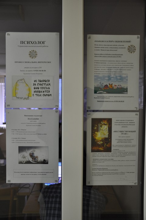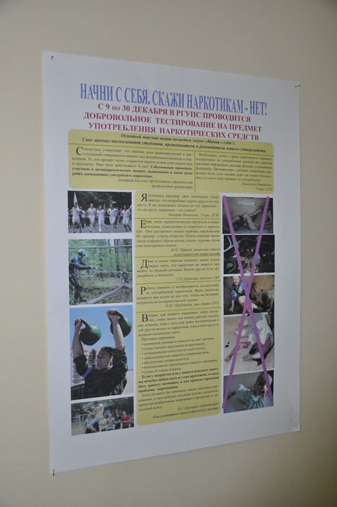В общежитии начала действовать комната антинаркотического воспитания, к работе в ней волонтеры серьезно подготовились. Здесь размещены плакаты, нарисованные лицеистами РГУПС, разработаны множество листовок, студенты могут посмотреть документальные и художественные фильмы, направленные против употребления наркотиков. Участники акции принимают участие в психологических тренингах и консультациях с врачами. Каждый принявший участие в тестировании крепит на специальном плакате зеленую ленточку.