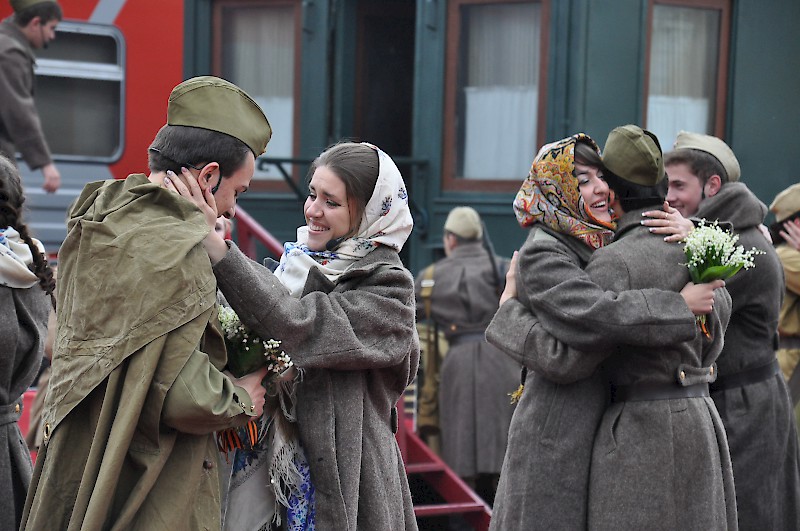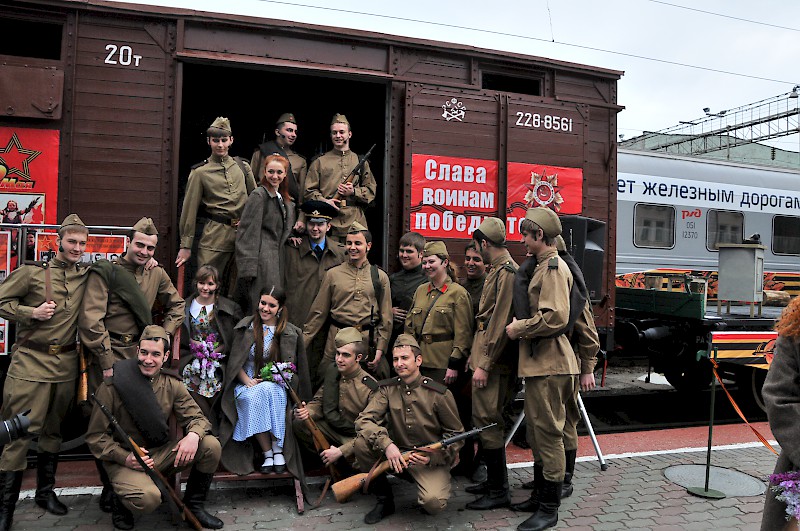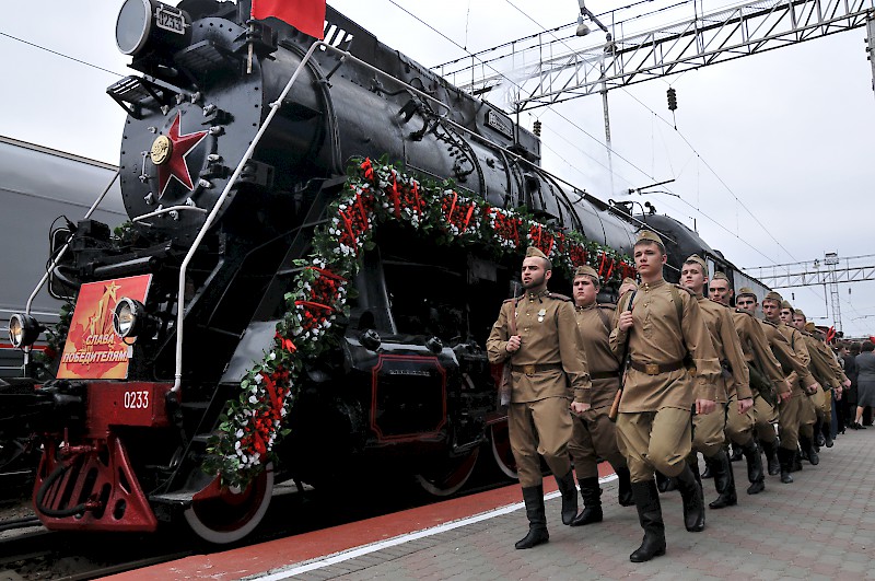 Поезд "Победа" сформирован из исторического подвижного состава времен Великой Отечественной войны. Его поведут два паровоза, один из которых принимал участие в Сталинградской битве. В составе: крытые товарные вагоны (теплушки), платформы (для перевозок военной техники), салон-вагон. Вся техника из экспозиции музея железнодорожной техники СКЖД.