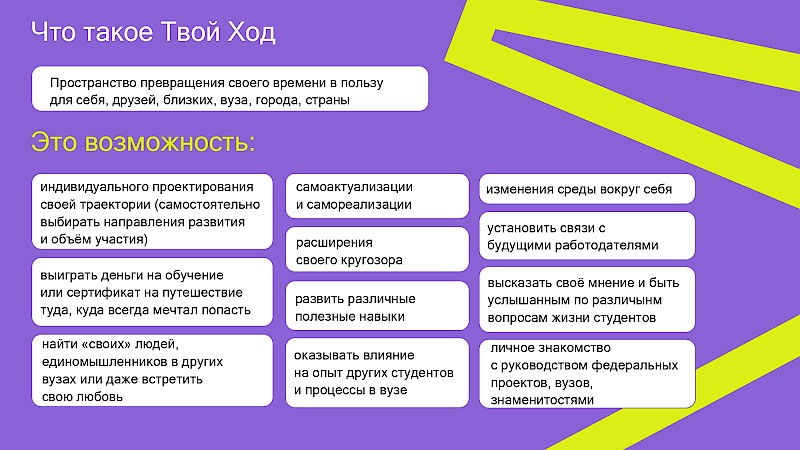 «Твой ход» – всероссийский студенческий конкурс. Организаторами конкурса выступают АНО «Россия – страна возможностей», Российский союз ректоров и Национальная лига студенческих клубов.