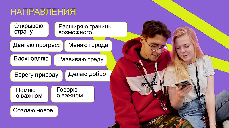 Конкурс включает 11 направлений: «Расширяю границы возможного» (спортивное направление), «Открываю страну» (развитие туризма, в том числе регионального), «Двигаю прогресс» (высокотехнологичные стартапы, проекты по автоматизации производств), «Меняю города» (промышленный и городской дизайн, digital-проектные решения в культурной сфере), «Вдохновляю» (творчество), «Развиваю среду» (урбанистическое развитие территорий), «Берегу природу» (разумное потребление, экологичное отношение к природе), «Делаю добро» (добровольческое и волонтерское движение), «Говорю о главном» (медиа, журналистика), «Помню о важном» (патриотизм, сохранение исторической памяти), «Создаю новое» (предпринимательство).