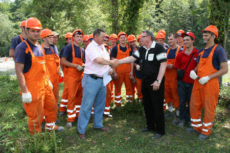 В последние дни июня ректор РГУПС В.И. Колесников выехал с рабочим визитом к месту работы студотряда «Дон». Владимир Иванович, в первую очередь, побывал на месте берегоукрепительных работ и ознакомился с бытовыми условиями проживания и досуга студентов. Стройотрядовцы готовят габионные конструкции для укрепления берега реки. Самым важным во встрече было общение с ребятами, которые рассказали Владимиру Ивановичу о своей новой трудовой жизни. «У нас настоящая мужская работа, рассказывает командир отряда Евгений Абубакиров. Работаем с 8 утра до 8 вечера. Условия жизни и питание хорошее. Вечером, уставшие после смены, бежим купаться в море, а после читаем и смотрим телевизор. Живем и работаем с настроением. Ведь мы же первопроходцы в великой стройке для Олимпиады 2014 и гордимся тем, что мы продолжили студенческую стройотрядовскую эстафету РИИЖТ- РГУПС и в нашей жизни есть такая яркая страница. Нам будет, что рассказать сокурсникам да и нашим детям и внукам». Ректор В.И. Колесников встретился с заместителем директора ООО «Мосгеоцентр» В. В. Малиновским и убедился в том, что к нашим ребятам относятся с должным вниманием и уважением. Во время этой встречи В.И. Колесников выразил благодарность руководству Министерства транспорта РФ и ОАО «Российские железные дороги» за поддержку отраслевого вузовского стройотрядовского движения. И в заключение, перефразируя известный лозунг сказал: «Олимпиада – это молодость спорта и ее объекты возводить молодым!»