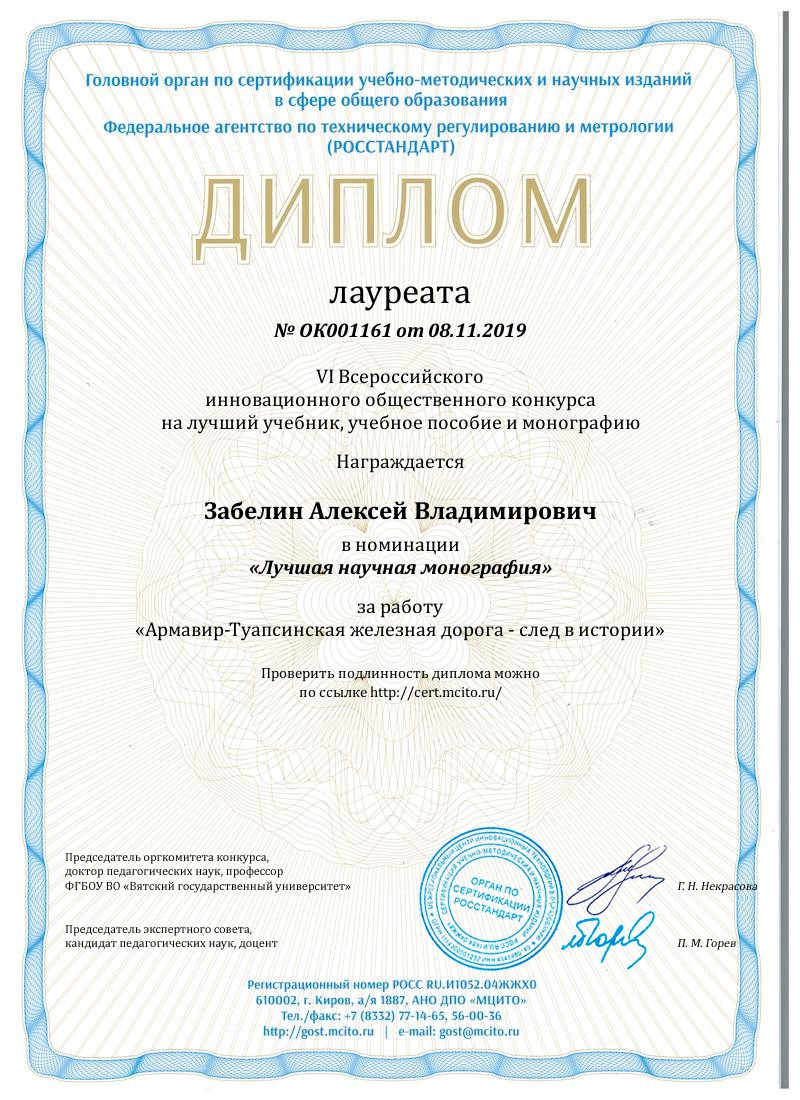 В номинации «Лучшая научная монография» признаны: учебное пособие и монография с книгой «Армавир-Туапсинская железная дорога – след в истории».
