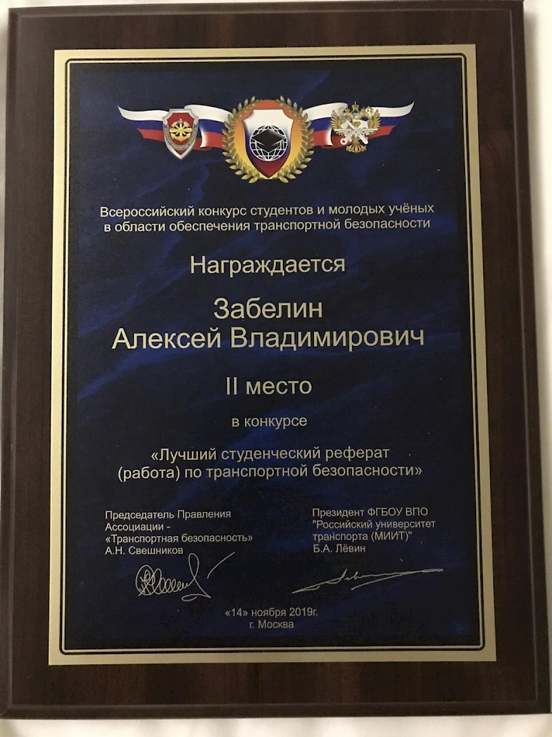 Студент факультета «Управление процессами перевозок» Алексей Забелин победитель конкурса «Лучший студенческий реферат по Транспортной безопасности» и «Молодые учёные в области обеспечения транспортной безопасности»