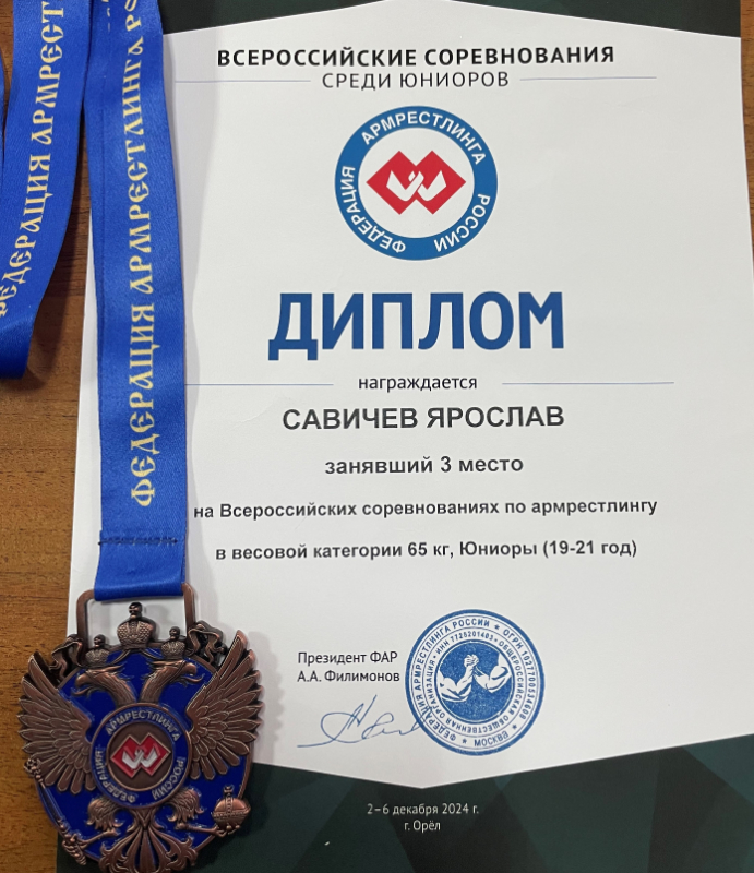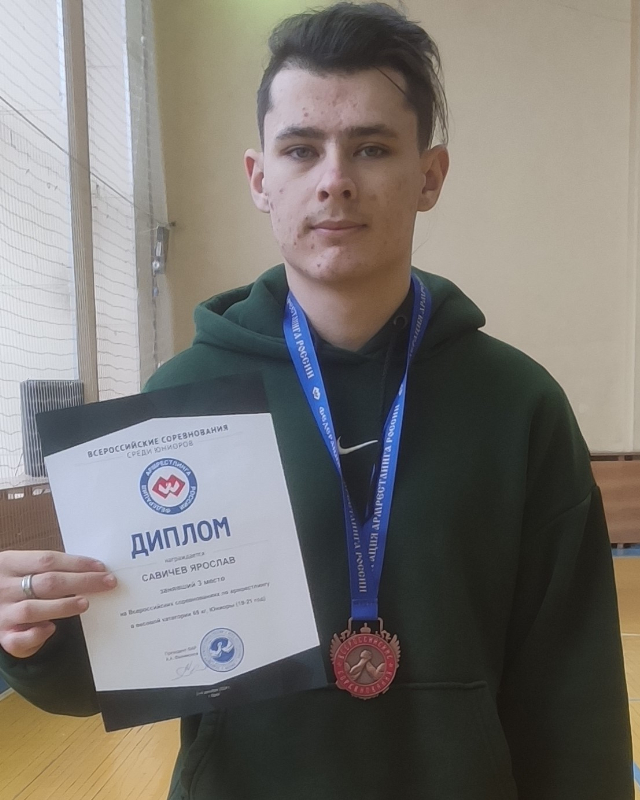 2-6 декабря в г. Орле прошли Всероссийские соревнования по армрестлингу среди юниоров. Студент факультета ИТУ Ярослав Савичев стал победителем турнира в весовой категории 65 кг. Поздравляем чемпиона и желаем дальнейших успехов!