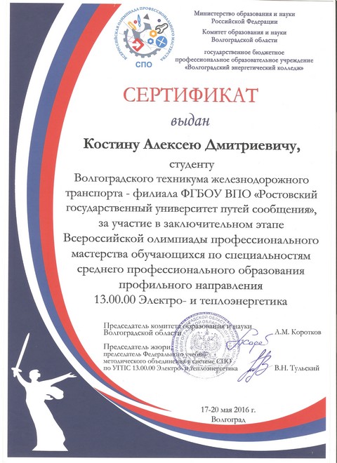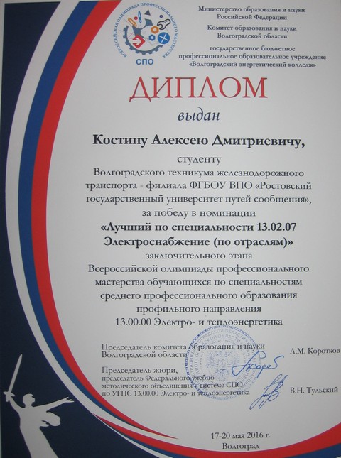 -13.02.11«Техническая эксплуатация и обслуживание электрического и электромеханического оборудования (по отраслям)». На Волгоградскую землю прибыли участники и гости из разных концов нашей огромной страны: Чувашии, Хакасии, Башкортостана, Дагестана, Республики Коми, Татарстана, Мордовии, Республики Саха (Якутия); Красноярского, Забайкальского, Краснодарского и Ставропольского краев; Ямало-Ненецкого и Ханты- Мансийского АО; Московской, Ростовской, Рязанской, Тульской, Воронежской, Тамбовской, Кировской Белгородской, Нижегородской, Мурманской, Свердловской, Сахалинской, Архангельской, Томской, Саратовской и Волгоградской областей; городов Екатеринбурга, Ульяновска, Брянска, Кургана, Оренбурга, Новосибирска, Владимира, Смоленска, Санкт-Петербурга, Иваново, Костромы, Самары. Всего 62 участника из 45 субъектов Российской Федерации! В заключительном этапе Всероссийской олимпиады профессионального мастерства принял участие и студент 3 курса Волгоградского техникума железнодорожного транспорта- филиала РГУПС, обучающийся по специальности 13.02.07 Электроснабжение (по отраслям), Костин Алексей – победитель Регионального этапа Всероссийской олимпиады профессионального мастерства. Заключительный этап Всероссийской олимпиады проводился в три этапа. 17.05.2016г. после торжественного открытия конкурсанты получили инструктаж по технике безопасности и приступили к выполнению олимпиадных комплексных заданий. Костин Алексей, студент группы 31 Э, прошел тестирование, охватывающее содержание тем по специальностям СПО профильного направления 13.00.00 Электро- и теплоэнергетика, а также выполнил практические задания, используя знания иностранного языка. 18 мая стартовал второй этап Олимпиады, который состоял из двух частей - выполнение задания в системе автоматизированного проектирования (САПР) и выполнение задания по подготовке работ производственного подразделения на энергетическом объекте. Благодаря качественной подготовке в филиале Костин Алексей достойно выдержал очередное испытание. 19 мая состоялся последний этапВсероссийской олимпиады. Уже ранним утром олимпийцы собрались для прохождения очередных конкурсных испытаний. Ребят разделили на шесть групп, каждая из которых должна была работать по своему графику. Все предлагаемые задания составлены с учетом профиля специальности и при их выполнении нужно было проявить не только знания, но умения и навыки, полученные за все годы обучения в своем учебном заведении. В электромонтажной мастерской студенты специальности13.02.07 Электроснабжение (по отраслям), в том числе и Костин Алексей должны были собрать схемы реверсивного управления асинхронным двигателем. Конкурсные задания данного этапа Олимпиады позволили всем участникам продемонстрировать уровень специфических для специальности практических навыков и показать свое умение применять их в будущей профессиональной деятельности. Жюри конкурса отметило высокий уровень технической подготовки Костина Алексея, а также соблюдение эстетики при сборке схемы. В рамках заключительного этапа необходимо было выполнить задание по охране труда и электробезопасности. В течение шести минут нужно определить состояние пострадавшего, пораженного электрическим током, и провести ему реанимационные мероприятия. В качестве пострадавшего был