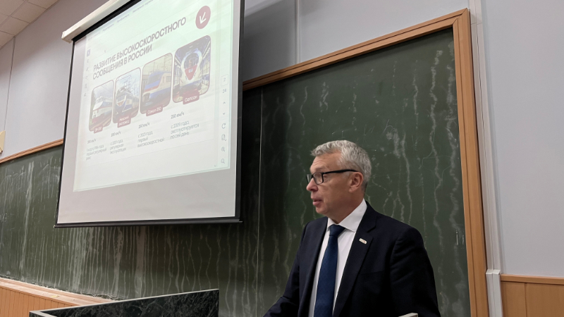 В ходе встречи Александр Евгеньевич рассказал об особенностях инфраструктуры компании ВСМ-Сервис, ключевой задачей которой является регулярное обслуживание и модернизация высокоскоростных поездов «Сапсан» и скоростных электропоездов «Ласточка» и «Финист» для комфортной и безопасной перевозки пассажиров. Достижение этого осуществляется внедрением и развитием современных технологий и применением высокотехнологического оборудования. Отдельное внимание уделил корпоративной культуре и социальной политике. Сообщил студентам о возможностях прохождения стажировки или производственной практики на оплачиваемых местах на предприятиях компании.