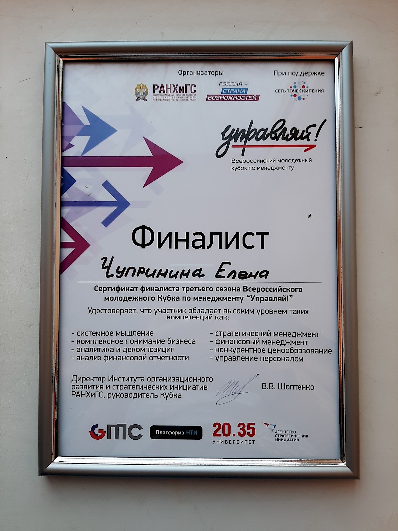 Финалистом кубка «Управляй!» стала Елена Чупринина из РГУПС. Заведующий выпускающей кафедрой А.В. Охотников отмечает, что выпускница 2021 года включена в кадровый резерв управленцев Дона!