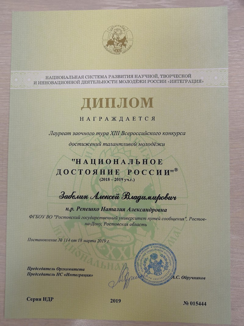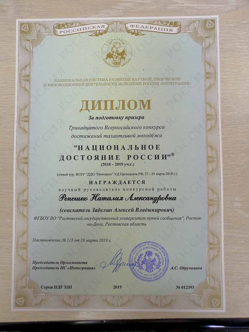 По результатам 13 Всероссийского заочного конкурса достижений талантливой молодежи «НАЦИОНАЛЬНОЕ ДОСТОЯНИЕ РОССИИ» «Национальная система развития научной, творческой и инновационной деятельности молодежи России «ИНТЕГРАЦИЯ» (НС «ИНТЕГРАЦИЯ») в финал конкурса прошли студент факультета «Управление процессами перевозок» Забелин А.В., научный руководитель – к.т.н., доцент кафедры «Станции и грузовая работа» Репешко Н.А.