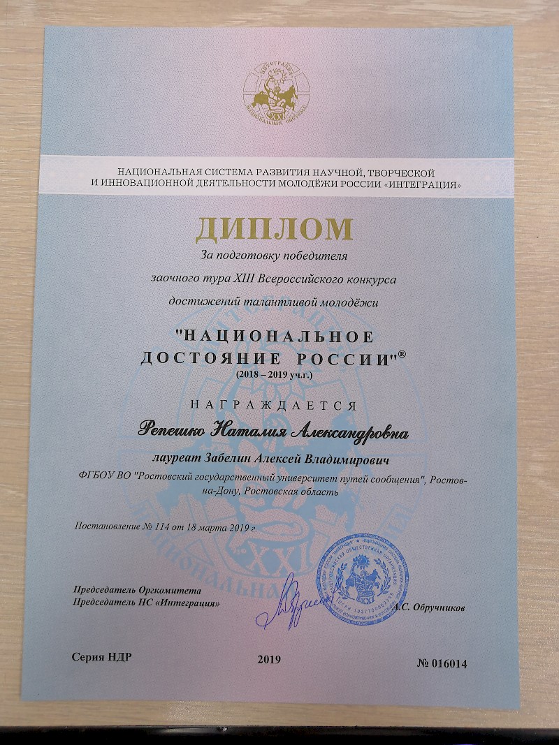 Студенты и преподаватели РГУПС победители Всероссийского заочного конкурса достижений талантливой молодежи «НАЦИОНАЛЬНОЕ ДОСТОЯНИЕ РОССИИ»