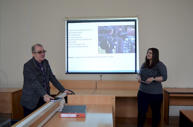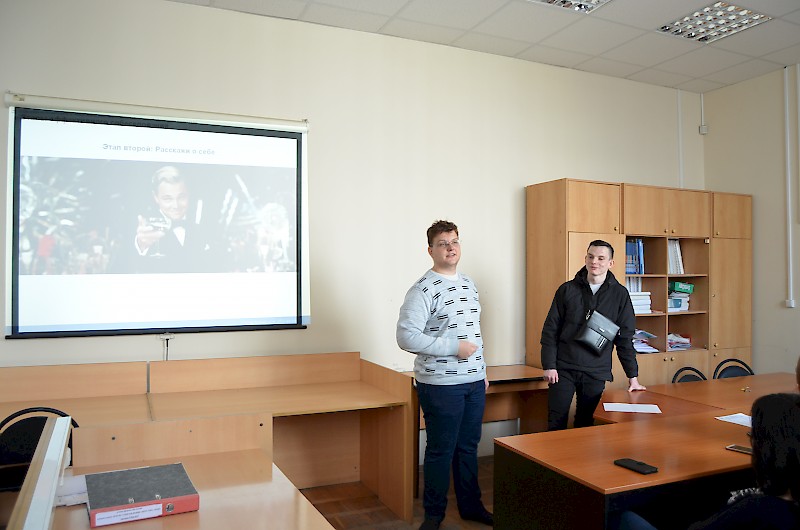 Бизнес тренеры компании Дом.ру Татьяна Рыбникова и Антонина Човен провели для студентов третьего и четвертого курса тренинг. Будущие менеджеры человеческих ресурсов погрузились в среду коммуникации отношений претендента на вакантное место с работодателем. Это поможет выпускникам найти себя на рынке труда.