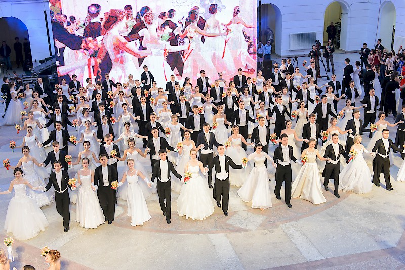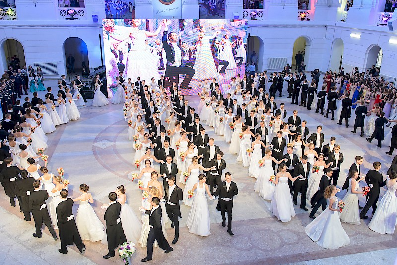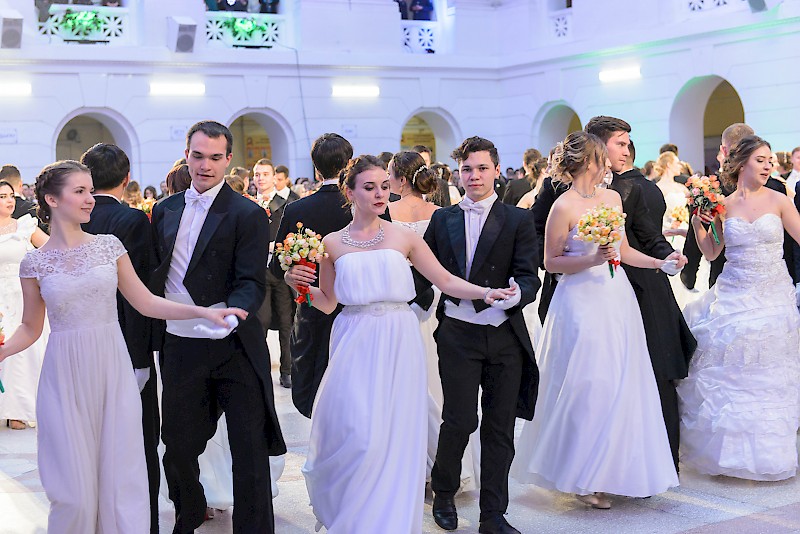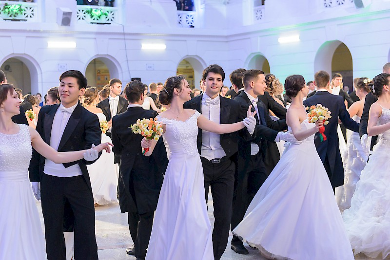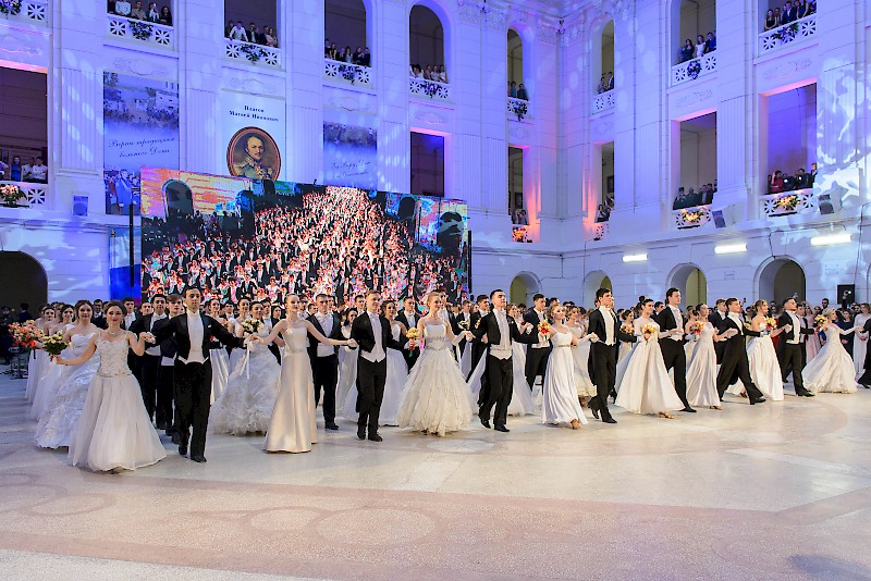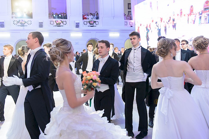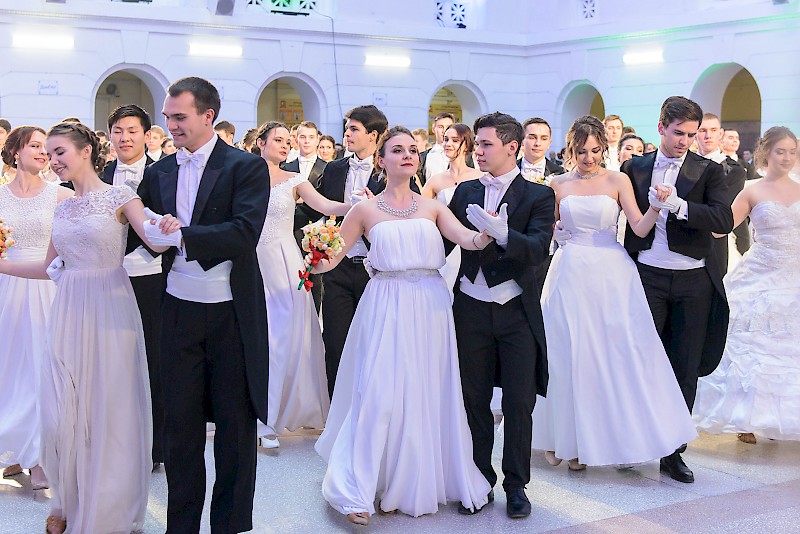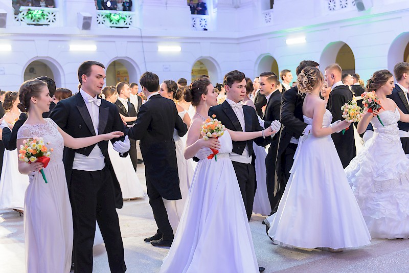 Элегантные юноши и очаровательные девушки в красивых нарядах кружили в вальсе и танцевали польку в лучших традициях балов.