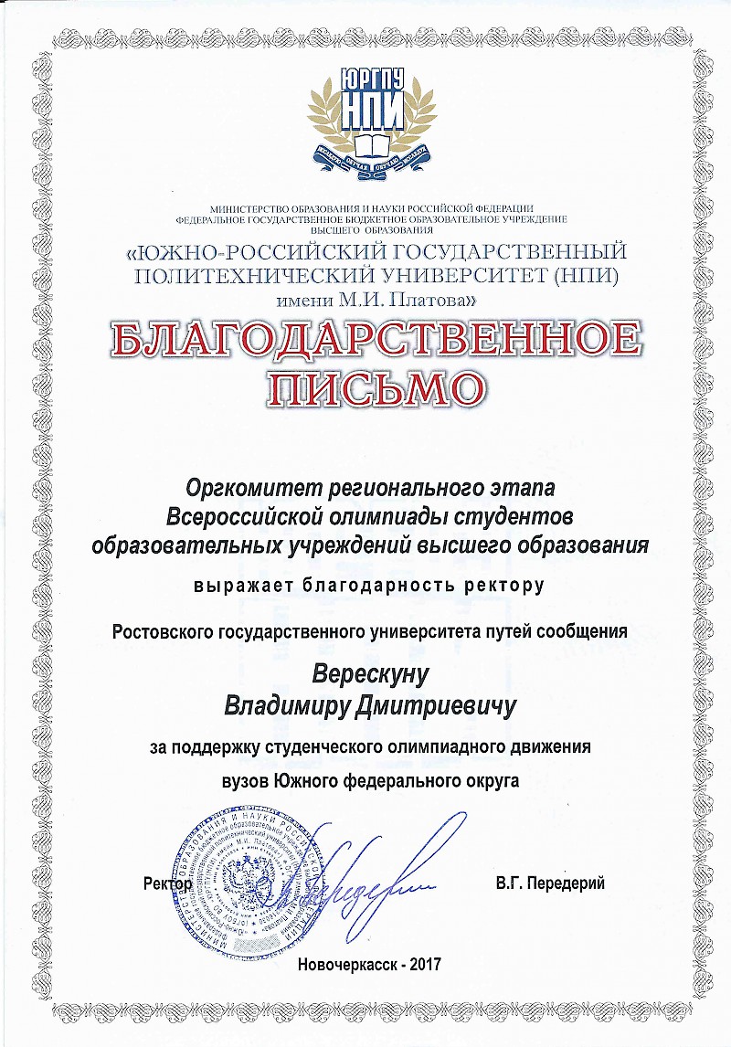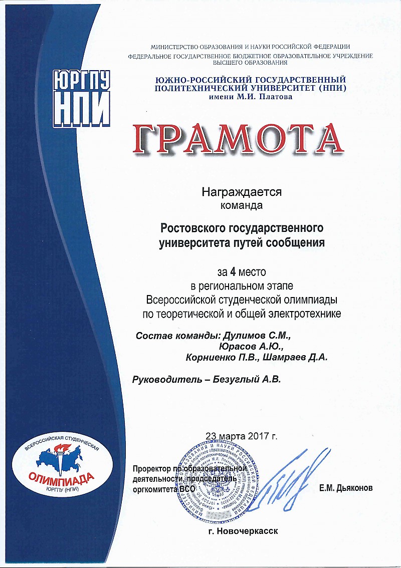 23 марта 2017 г. в г. Новочеркасске на базе Федерального государственного бюджетного образовательное учреждение высшего образования "Южно-Российский государственный политехнический университет (НПИ) имени М.И. Платова" состоялся второй региональный этап Всероссийской олимпиады студентов образовательных учреждений высшего образования (ВСО) по Теоретическим основам электротехники.