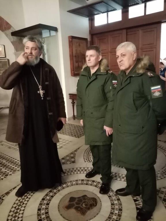 Экскурсию для студентов-слушателей военного учебного центра и офицеров провел настоятель главного православного храма Южного военного округа, руководитель отдела по взаимодействию с Вооруженными силами и правоохранительными органами Ростовской-на-Дону епархии, помощник командующего войсками Южного округа по работе с верующими военнослужащими, настоятель храма, протоиерей Валерий Волощук.