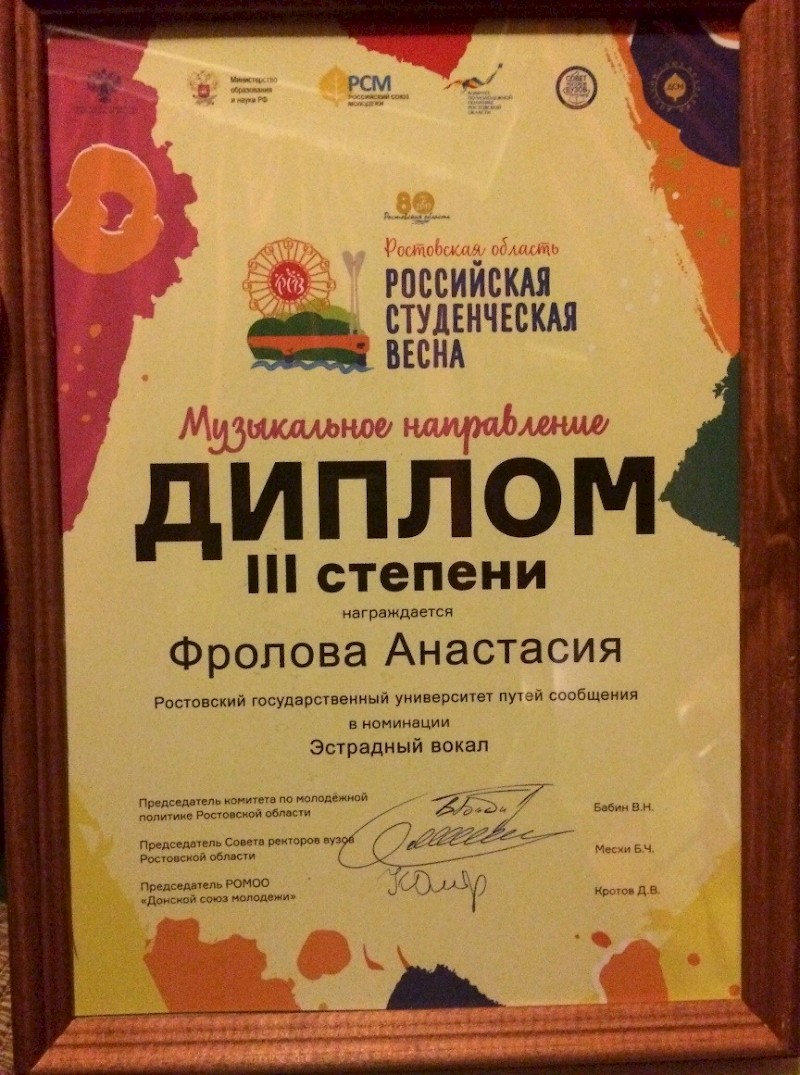 III место в номинации «Эстрадный вокал (соло)» – Фролова Анастасия (факультет ДСМ);