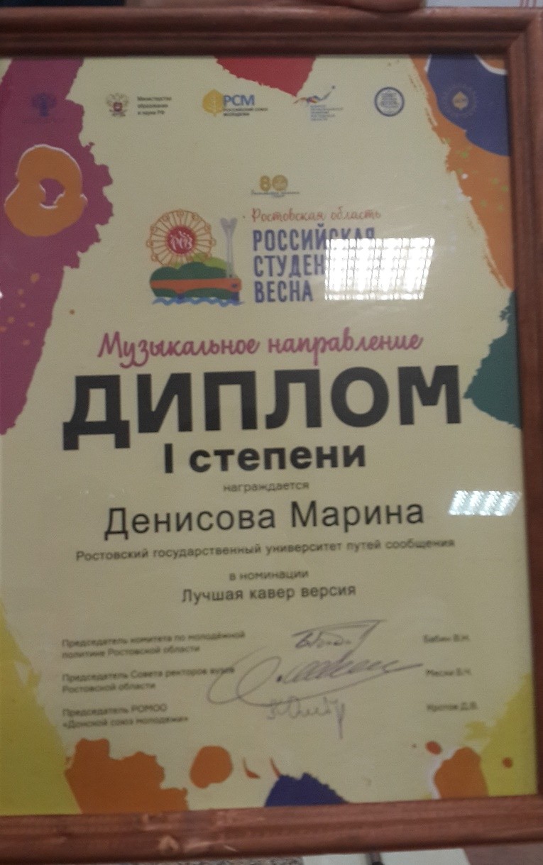 I место в номинации «Лучшая кавер версия» – Денисова Марина (факультет ДСМ);