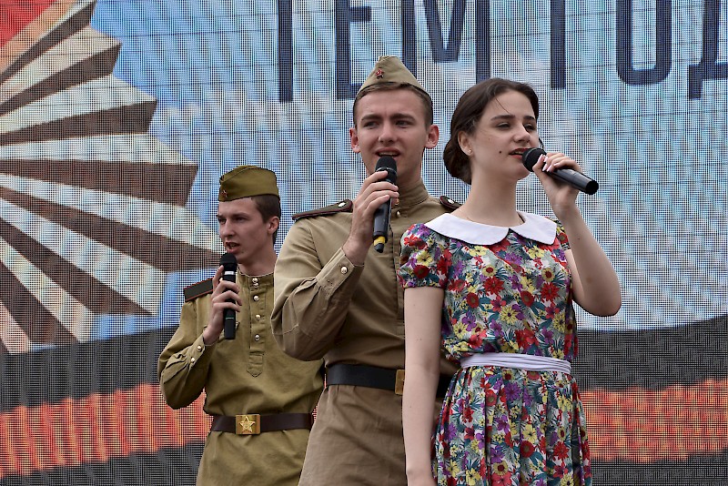 Всеми любимые песни фронтовых лет прозвучали в исполнении участников Народного эстрадно-вокального ансамбля «Успех» Ростовского государственного университете путей сообщения (руководитель коллектива – Ася Компаниец).