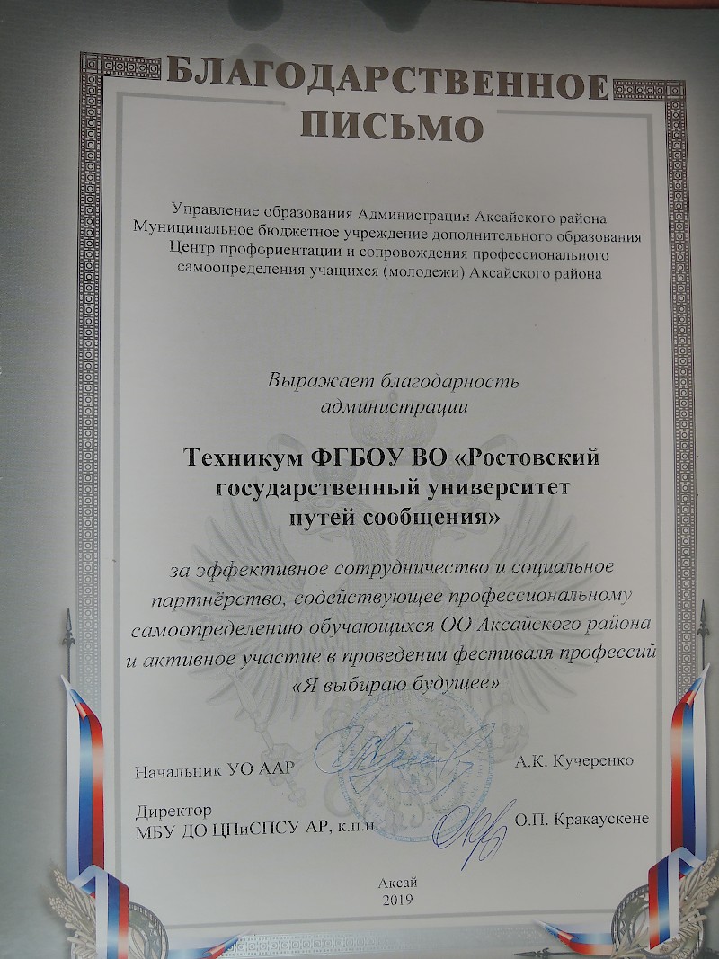 За эффективное сотрудничество, содействующее профессиональному самоопределению обучающихся, техникум отмечен благодарственным письмом Администрации Аксайского района Ростовской области.