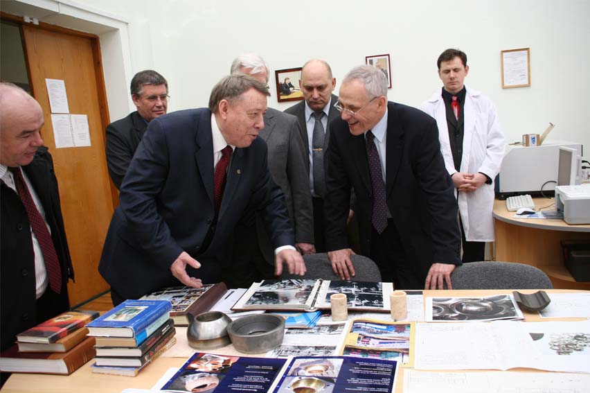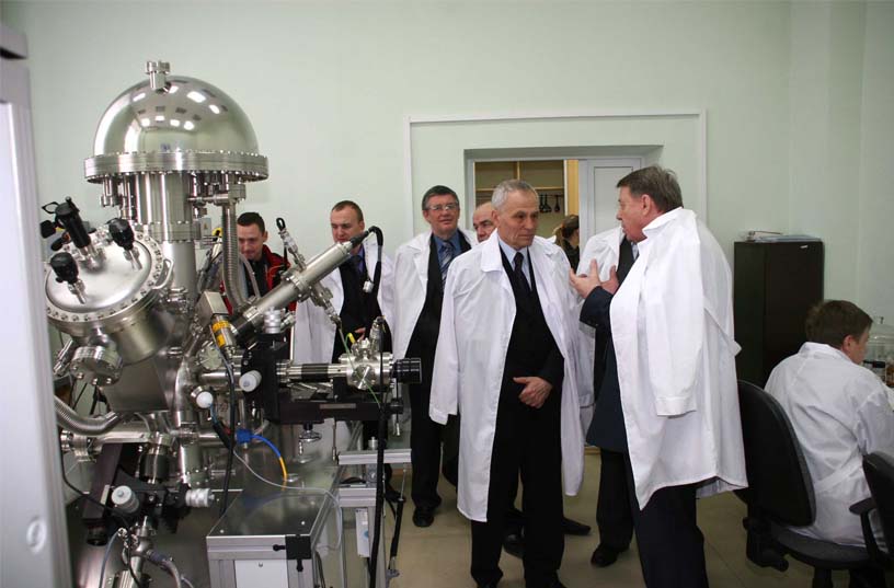 На фото: Знакомство с достижениями в области нанотехнологий и новых материалов. На переднем плане: Г.А. Рапота(слева), Колесников В.И. (справа). p>