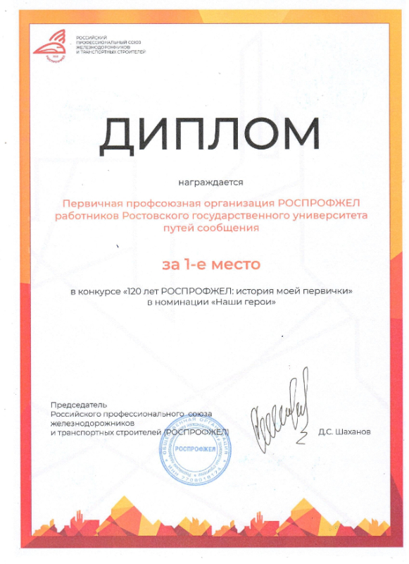 Также на Съезде профсоюзных работников наградили государственными и отраслевыми наградами. Председателю ППО работников РГУПС Ивану Анатольевичу Яицкову был вручен диплом за 1-е место во Всероссийском конкурсе «120 лет РОСПРОФЖЕЛ: история моей первички» в номинации «Наши герои».