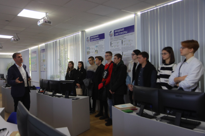 Экскурсию по Диспетчерскому центру управления перевозками провел Е.Р. Дельмухаметов – заместитель начальника центра. Евгений Рашидович рассказал о структуре управления центром, познакомил ребят с диспетчерскими кругами, основными обязанностями поездного диспетчера и особенностями его работы. Также руководитель поделился своим жизненным опытом и основными этапами карьерного роста, обратил внимание на необходимость получения крепких знаний, умений и навыков, в том числе при работе в коллективе.