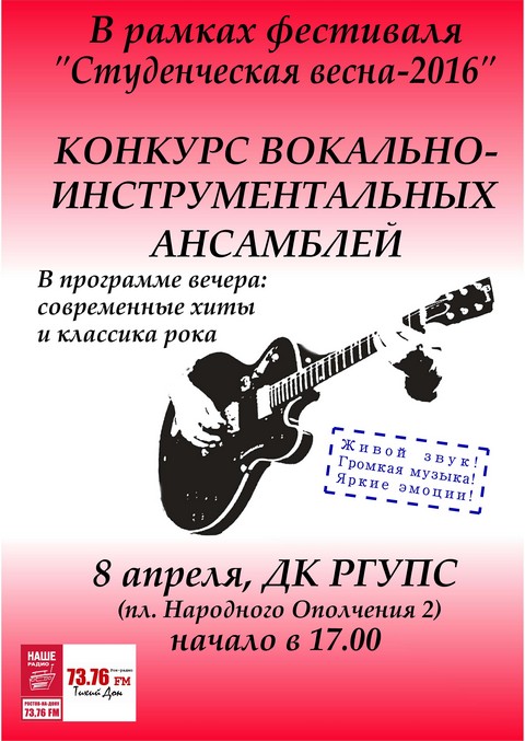 - В рамках фестиваля «Студенческая весна -2016» 8 апреля в ДК РГУПС состоится конкурс вокально-инструментальных ансамблей.