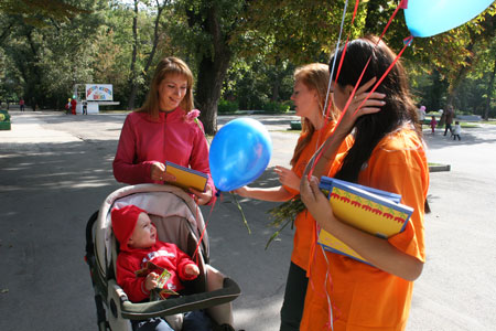 Студенты-волонтеры при подходах к детским садам, родильным домам, на детских площадках, на главном железнодорожном вокзале и в парке им. Октябрьской революции г. Ростова-на- Дону, а так же в г. Батайске Ростовской области вручали цветы женщинам с детьми и будущим мамам со словами благодарности просто за то, что они мамы, а также молодым девушкам дарились альбомы «Мой малыш» с пожеланиями родить здорового и красивого ребенка.