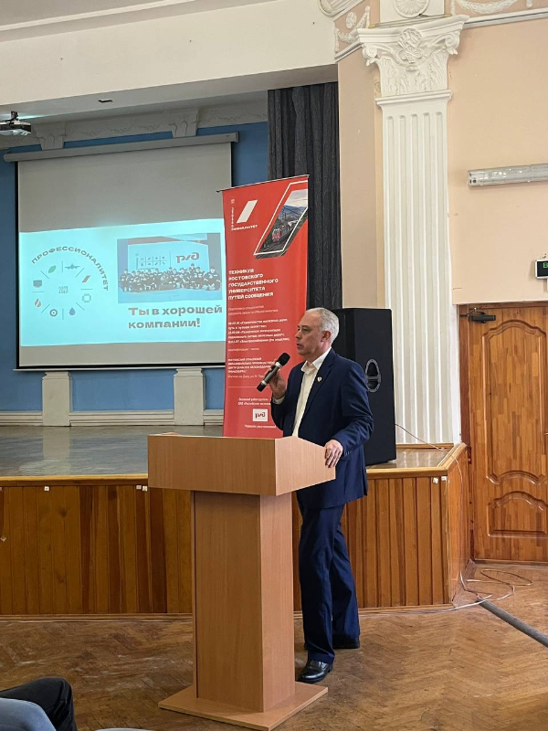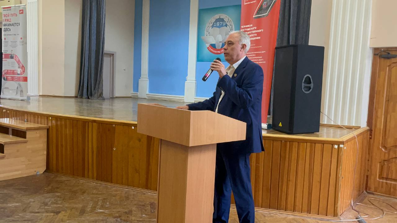 Директор техникума Ростовского государственного университета путей сообщения Мазуренко А.В. презентовал ролик компании «Российские железные дороги» и вместе с амбассадорами Профессионалитета ответил на многочисленные вопросы школьников.