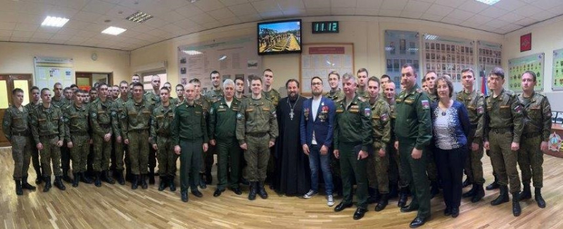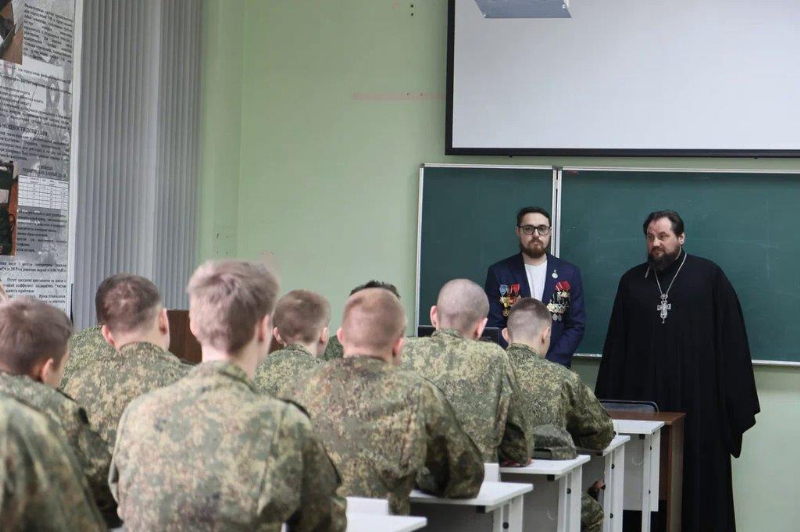 После открытия выставки прошла встреча студентов – слушателей Военного учебного центра с Председателем епархиального отдела по взаимоотношениям с казачеством Ростовской-на-Дону епархии, настоятелем Патриаршего Вознесенского Всеказачьего собора г. Новочеркасска, войсковым священником, проиереем Георгием Сморкаловым и Председателем Ассоциации ветеранов СВО Ростовской области С.С. Сазоновым.