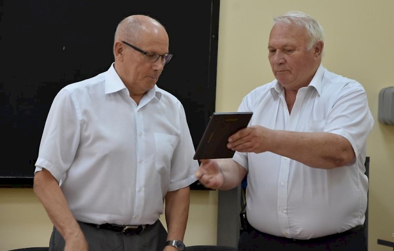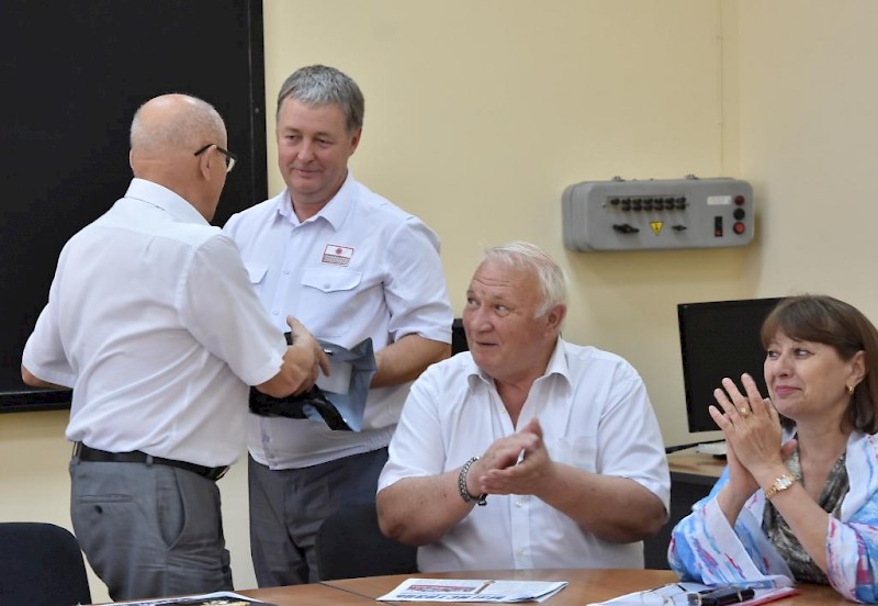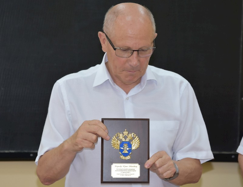 В завершение круглого стола в торжественной обстановке заведующему кафедрой «Автоматизированные системы электроснабжения», заслуженному работнику транспорта РФ, доктору технических наук, профессору Юрию Ивановичу Жаркову был вручен почетный знак Федеральной службы по надзору в сфере транспорта «За личный вклад в развитие железнодорожного транспорта». Награду вручил Георгий Борисович Якимов – старший эксперт управления Федеральной службы по надзору в сфере транспорта (РОСТРАНСНАДЗОР) Минтранса РФ.