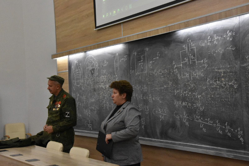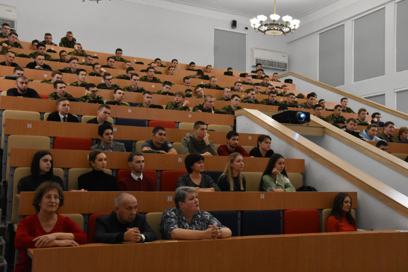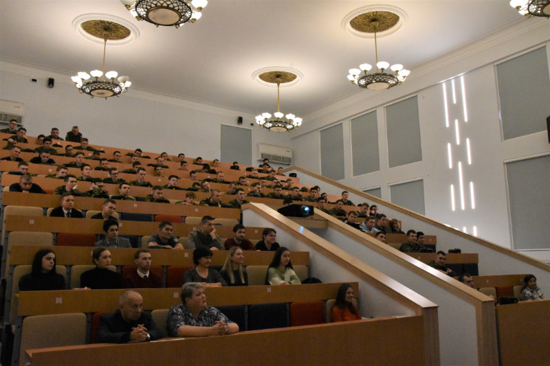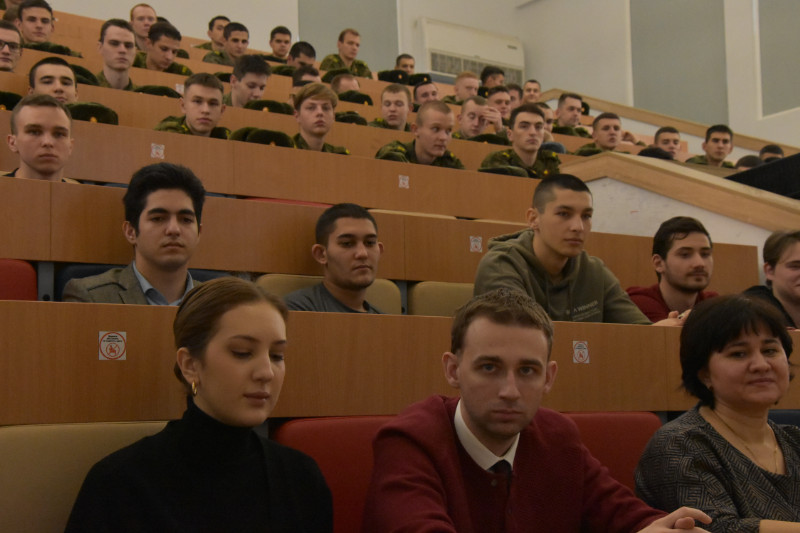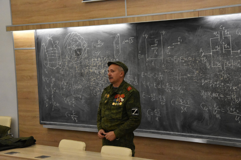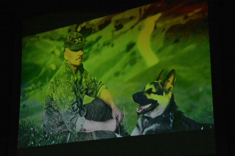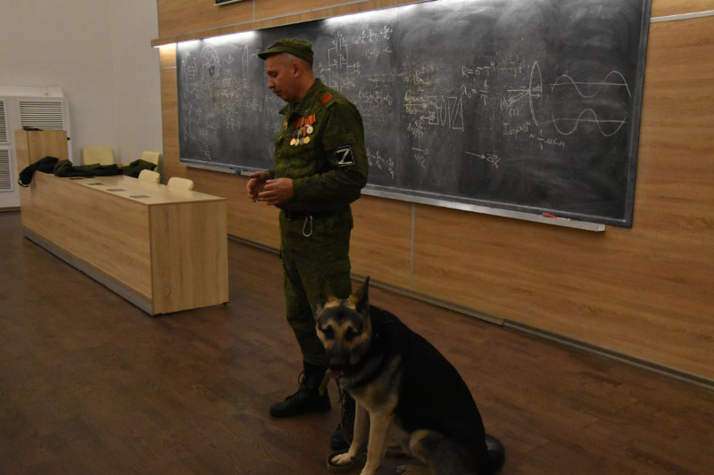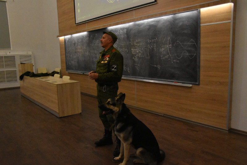 Во время встречи студенты смогли увидеть документальный фильм о службе собак в зане СВО, примерить бронежилет, задать вопросы и пообщаться с Черкесом.