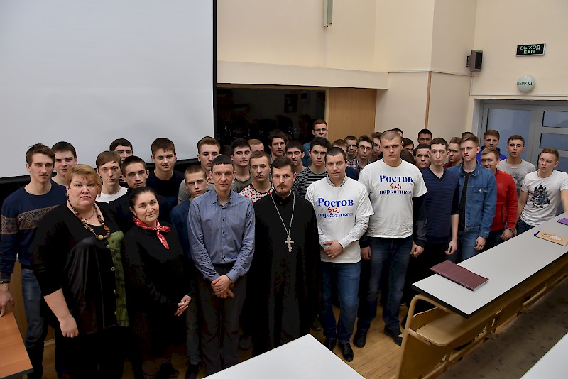06 марта состоялась встреча студентов факультета «Дорожно-строительные машины» с настоятелем храма святого праведного Иоанна Кронштадтского иереем Владиславом Паланчевым и представителями Ростовской областной общественной организации «Ростов без наркотиков». В ходе встречи обсуждались вопросы проблем распространения наркотиков в молодёжной среде; правовым, медицинским и социальным последствиям употребления различных наркотических веществ; был продемонстрирован документальный фильм, посвященный проблеме наркотизации молодежи «Секреты манипуляции. Наркотики»; своим трудным жизненным опытом поделились воспитанники реабилитационного центра РООО «Ростов без наркотиков». В завершении встречи студенты получили ответы на все возникшие у них вопросы.