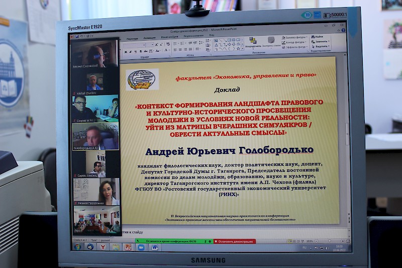 Открыл конференцию кандидат филологических наук, доктор политических наук, депутат Городской Думы г. Таганрога, Председатель постоянной комиссии по делам молодёжи, образованию, науке и культуре, директор Таганрогского института имени А.П. Чехова (филиал) ФГБОУ ВО «РГЭУ (РИНХ)» Андрей Юрьевич Голобородько. В своем докладе А.Ю. Голобородько подробно остановился на необходимости правового и культурно-исторического просвещения молодежи в условиях новой реальности и поделился опытом, накопленным в этой области Таганрогским институтом имени А.П. Чехова.