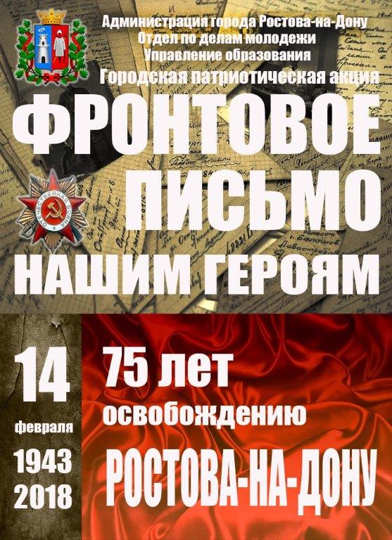 С целью поддержки и развития системы гражданско-патриотического воспитания детей и молодежи, а также сохранения памяти о ветеранах и участниках Великой Отечественной войне, сражавшихся за освобождение города Ростова-на-Дону от немецко-фашистских захватчиков отдел по делам молодежи Администрации города Ростова-на-Дону совместно с Управлением образования организует Городскую патриотическую Акцию «Фронтовое письмо нашим Героям».