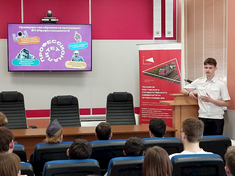 Открывая встречу с родителями А.Е. Фатеев сказал: «Профессионалитет – это наш ответ стремительно меняющимся экономическим и производственным условиям страны. Потребность в профессиональных кадрах сегодня как никогда высока. Идти в ногу со временем и получать современное профессиональное образование поможет наш проект». Директор техникума РГУПС А.В. Мазуренко познакомил абитуриентов и их родителей с полуторавековой историй техникума, с реализуемыми в техникуме специальностями, рассказал о Ростовском отраслевом производственно-образовательном кластере железнодорожного транспорта, созданном в рамках реализации федерального проекта «Профессионалитет», уделил особое внимание профессиональному росту выпускников техникума, представив карьерные карты железнодорожников. На собрании родители школьников также узнали и о возможностях трудоустройства на предприятия компании «Российские железные дороги».
