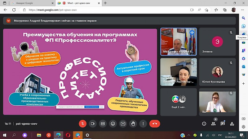 Одним из ключевых событий Единого дня открытых дверей ФП «Профессионалитет» стало родительское собрание, которое прошло в онлайн-формате 22 апреля, в котором приняли участие более 1300 школьников Ростовской области и их родителей. На собрании Ростовский отраслевой образовательно-производственный кластер железнодорожного транспорта представляли министр общего и профессионального образования Ростовской области Фатеев А.Е. и директор техникума РГУПС Мазуренко А.В.