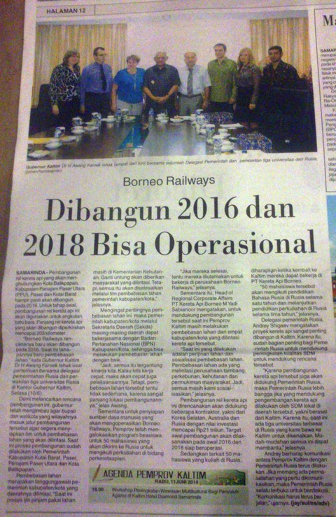 В период с 8 по 12 июня 2014г. состоялся визит делегации Московского, Петербургского и Ростовского университетов путей сообщения в г. Самаринда (провинция Восточный Калимантан, Индонезия) в рамках подготовки к реализации образовательных программ с администрацией провинции и фирмой Kalimantan Rail PTE Ltd. (дочерней компанией ОАО «РЖД»), являющейся соорганизатором проекта строительства новой грузовой железнодорожной магистрали на острове Борнео.