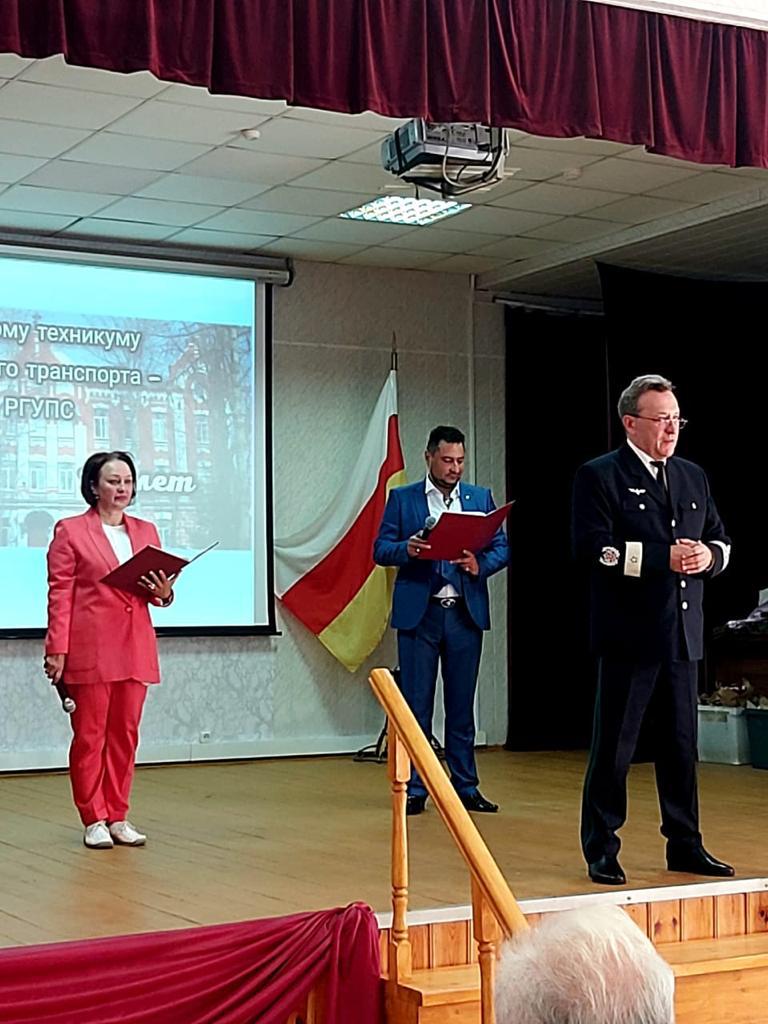 Были вручены высокие ведомственные награды директору техникума М.К. Чеджемову, преподавателям, сотрудникам. Присутствующие с вниманием просмотрели видеофильм об истории техникума, видеопоздравления от директоров «Высшего колледжа транспорта и коммуникаций» акимата города Астана Республики Казахстан и Оршанского колледжа – филиала Белорусского государственного университета транспорта Республики Беларусь О.Г. Жунуспекова и Е.Н. Козловой.