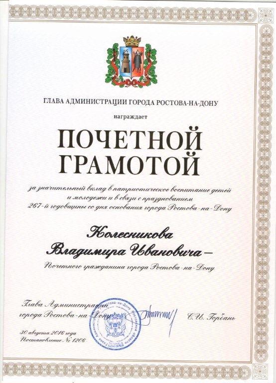 Владимир Иванович Колесников, президент РГУПС, академик Российской академии наук, Почетный гражданин города Ростова-на-Дону, награждён Почётной грамотой «За значительный вклад в патриотическое воспитание детей и молодёжи и в связи с празднованием 267-й годовщины со дня основания города Ростова-на-Дону». Награду вручил глава Администрации города Сергей Горбань во время торжественного приема Почётных граждан Ростова-на-Дону, который состоялся в преддверии праздника.