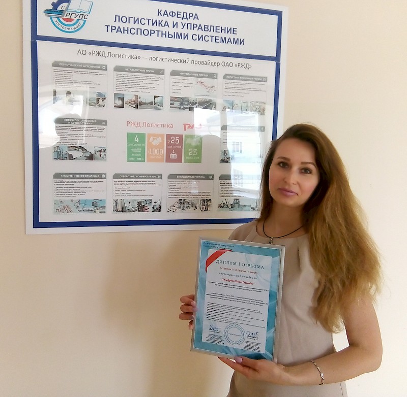 Победу в номинации «Выпускная квалификационная работа с практической значимостью» среди выпускников аспирантуры в категории «Логистика. Экономика, организация и управление предприятиями, отраслями, комплексами» одержала аспирантка факультета «Управление процессами перевозок» Хамбурова Диана Сергеевна, научный руководитель д.т.н., профессор, заведующий кафедрой «Логистика и управление транспортными системами» Мамаев Энвер Агапашаевич.