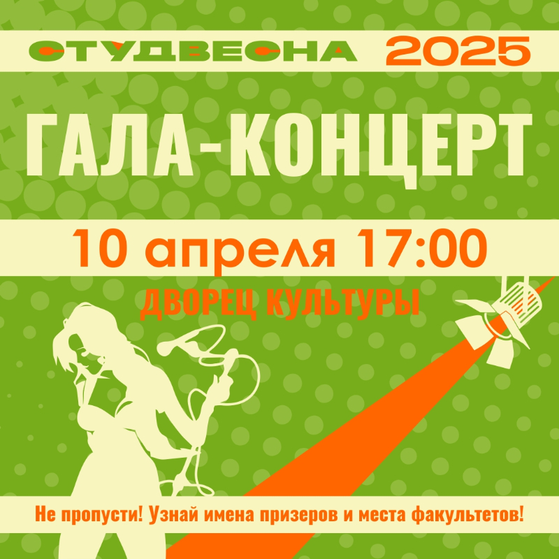 На гала-концерте вы увидите лучшие номера и узнаете места призеров конкурса "Сценическое искусство", победителей в конкурсе зрительских симпатий и, конечно, названия факультетов-победителей! Не пропусти! Приходи за творческой энергией и поддержи свой факультет!