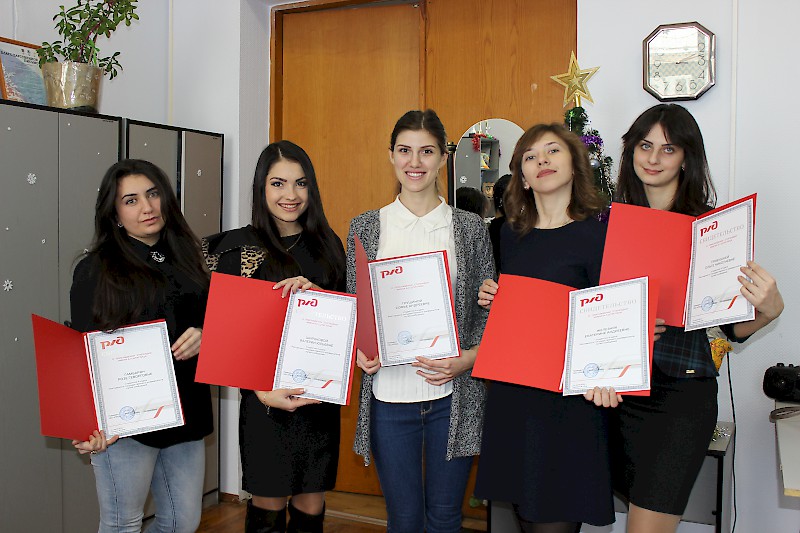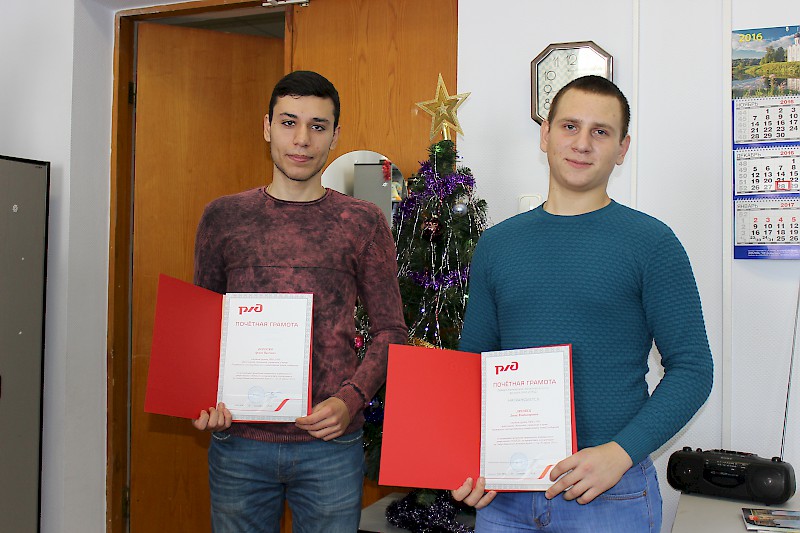 Почетными грамотами начальника Северо-Кавказской железной дороги В.Г. Пястолова были награждены студенты учебной группы ПФБ-2-009 Денис Ляховец и Армен Погосян за активное участие в организации акции «Ретро-поезд Победы».