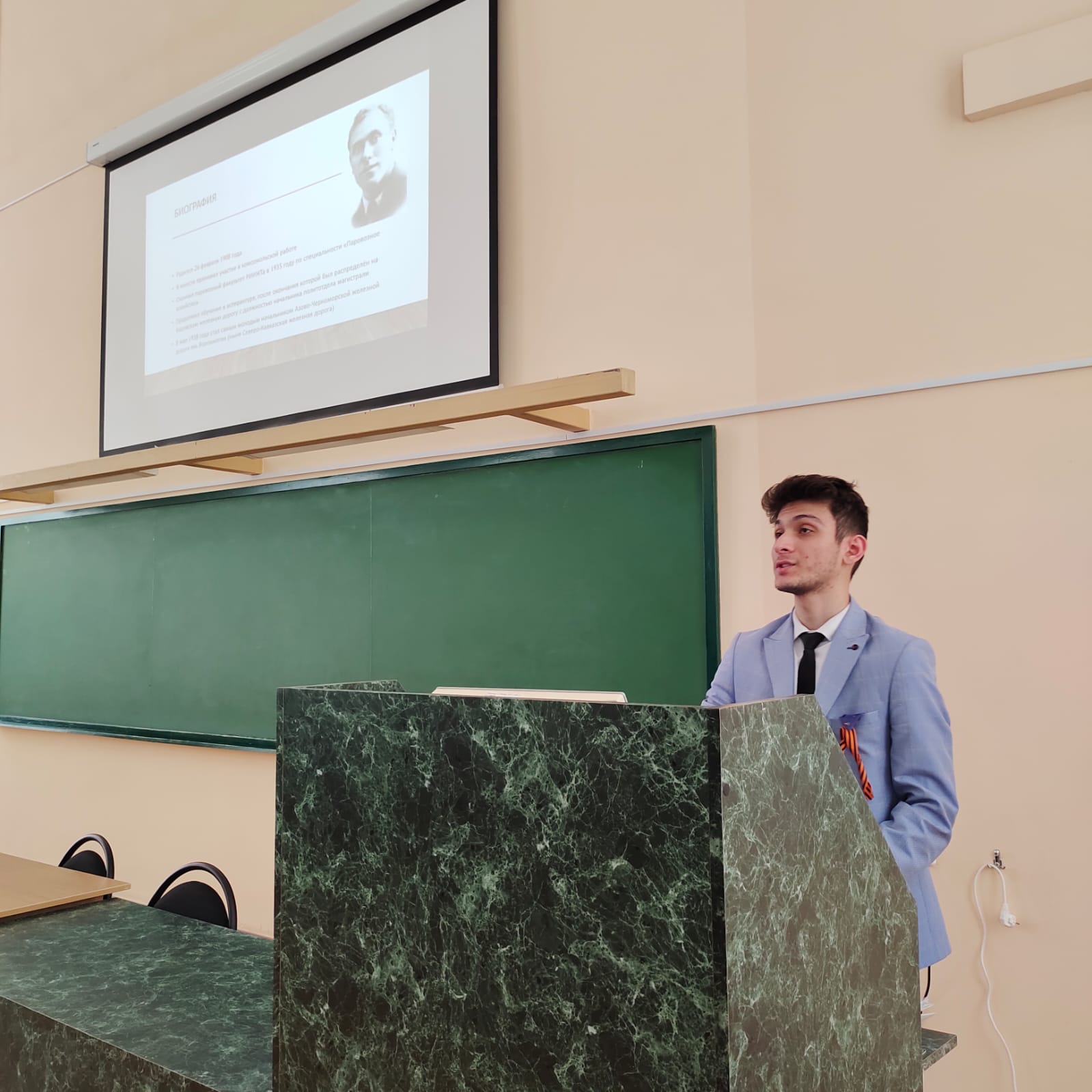Студент группы МЭС-1-717 Чучин Владимир подготовил и представил интересные исторические факты о формировании Ростовского Стрелкового Полка Народного ополчения, а студент группы МСС-1-015 Бондаренко Артём – с информацией о вкладе железнодорожников в общую победу над нацизмом, и о выпускнике факультета, начальнике Азово-Черноморской железной дороге- Нецветае Алексее Игнатьевиче. Красюков Алексей- студент группы МЭС-4-698 поделился страницами истории своей семьи, рассказав о вкладе своего прадеда в участие и Победу в Великой Отечественной войне.