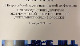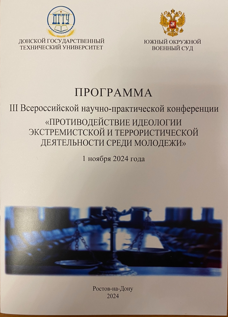 1 ноября 2024 года доцент кафедры «Административное право и уголовно-правовые дисциплины» Миллерова Елена Александровна приняла участие в III Всероссийской научно-практической конференции «Противодействие идеологии экстремистской и террористической деятельности среди молодежи», состоявшейся в Южном окружном военном суде.