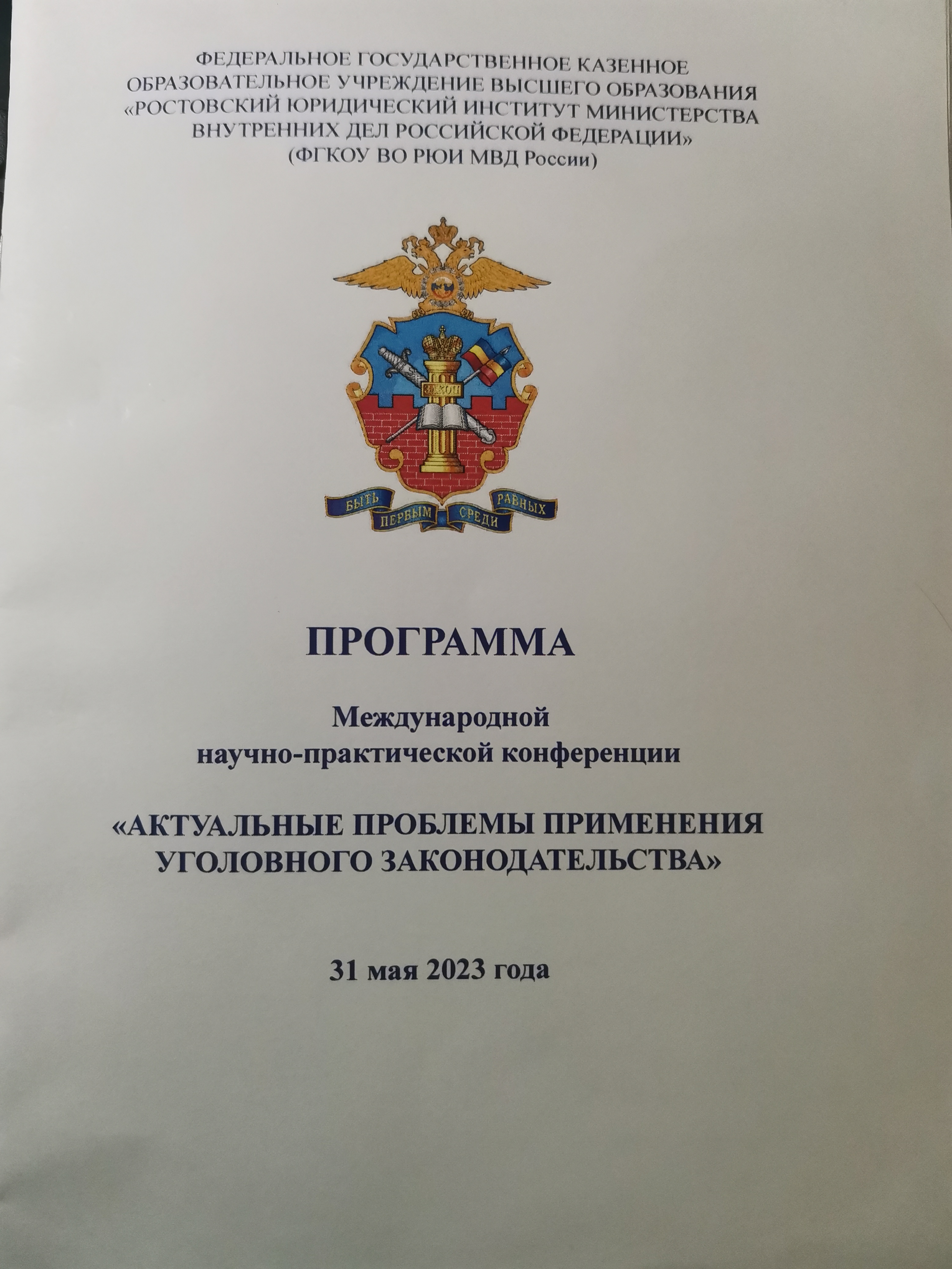 31 мая 2023 года в Ростовском юридическом институте МВД России состоялась международная научно-практическая конференция «Актуальные проблемы применения уголовного законодательства» в которой приняли участие зав.кафедрой «Административное право и уголовно-правовые дисциплины» к.ю.н., доцент И.П. Напханенко и доцент этой же кафедры, к.ю.н., доцент Е.А. Миллерова.