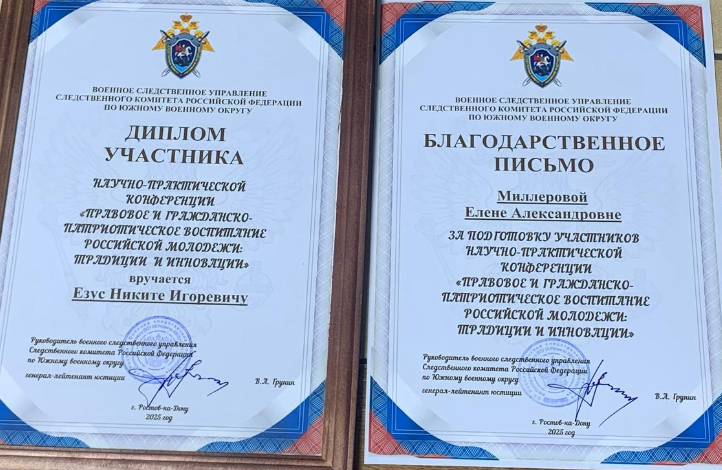 19 февраля 2025 г. студенты направления подготовки Юриспруденция Езус Н., Клищенко А., Криворучко Р., Сазонов И. приняли участие в научно-практической конференции «Правовое и гоажданско- патриотическое воспитание российской молодежи: традиции и инновации», состоявшейся в Доме офицеров Южного военного округа при участии сотрудников военного СК РФ по ЮФО.