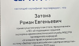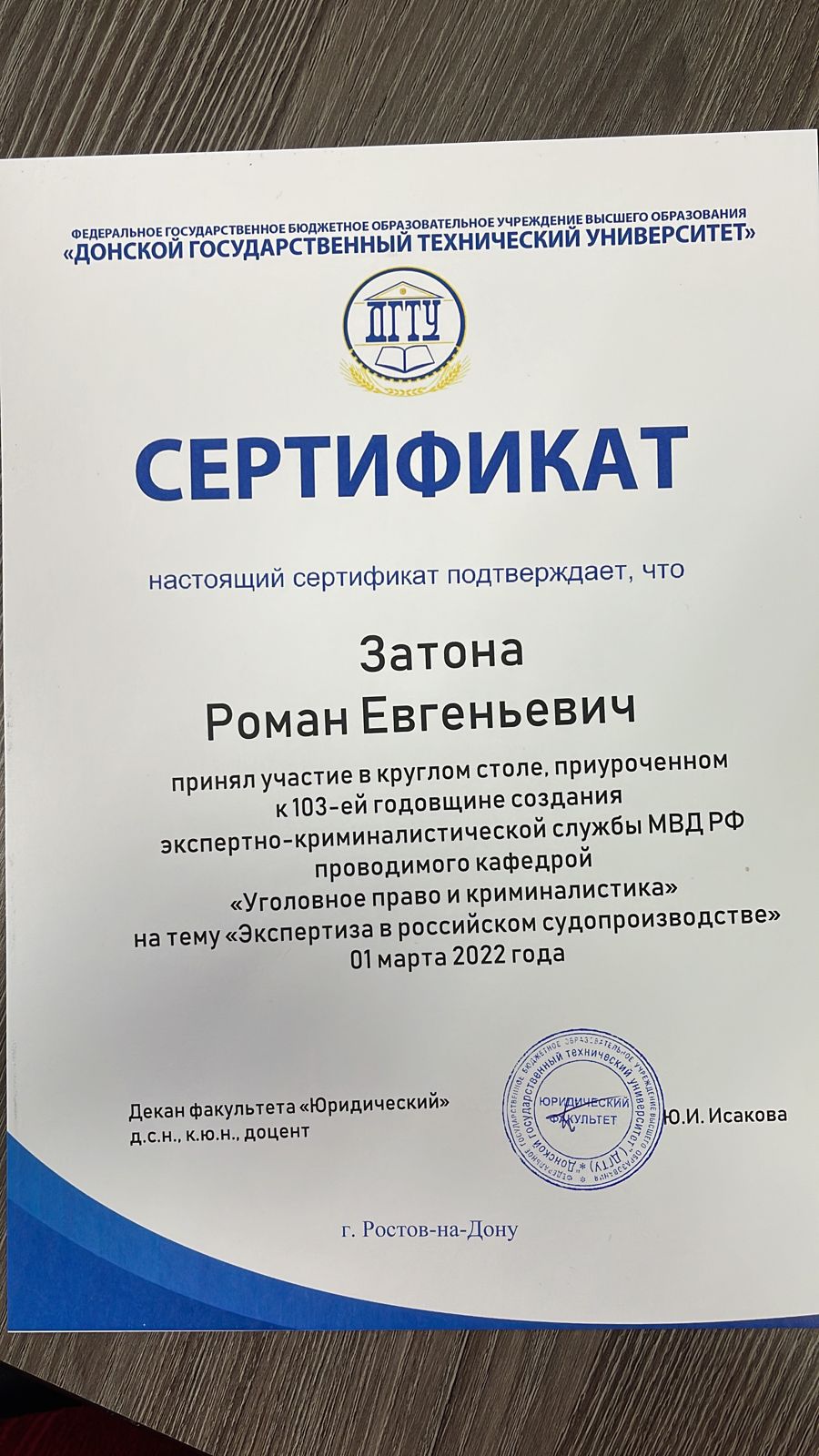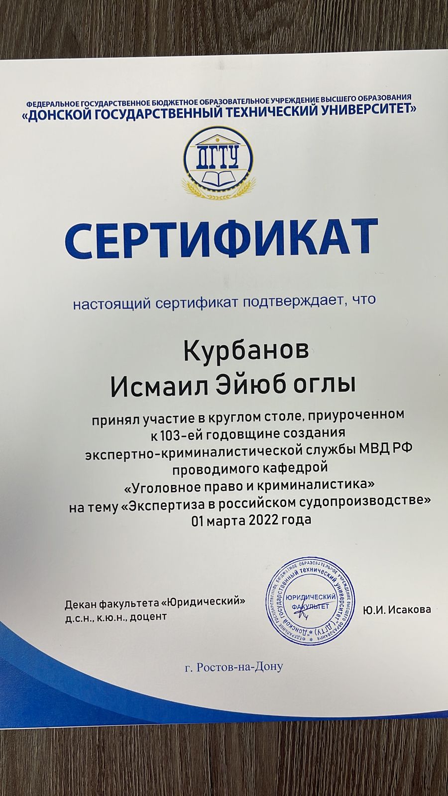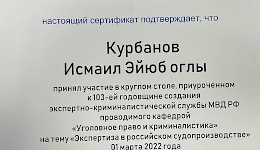 1 марта 2022 года студент группы ПУБ-4-018 факультета «Экономика, управление и право» Курбанов Исмаил совместно с доцентом кафедры «Административное право и уголовно-правовые дисциплины» к.ю.н. Затона Р.Е. приняли участие в круглом столе «Экспертиза в российском судопроизводстве», приуроченном к 103-ей годовщине создания экспертно-криминалистической службы МВД РФ, проводимого кафедрой «Уголовное право и криминалистика» ФГБОУ ВО ДГТУ.