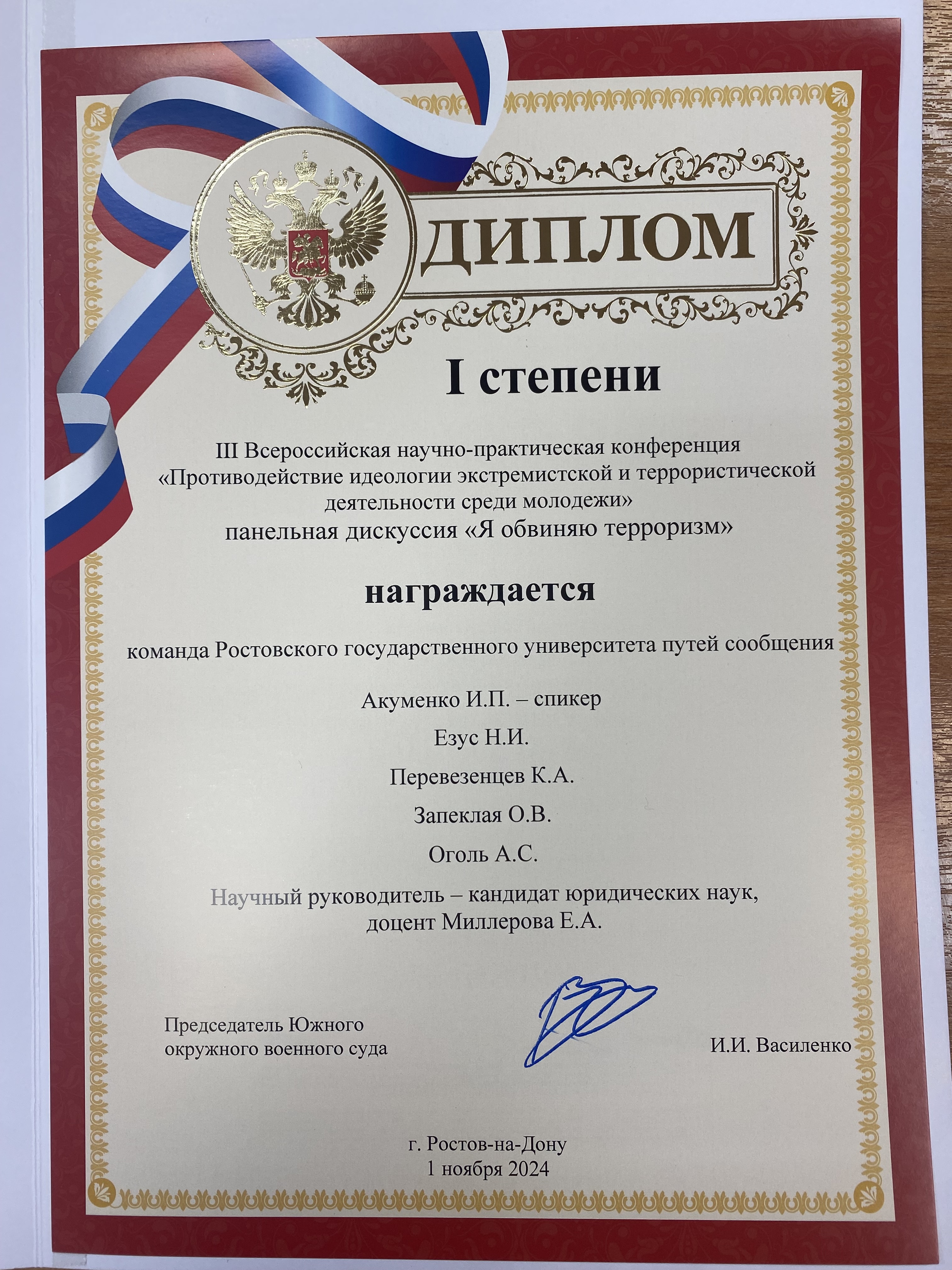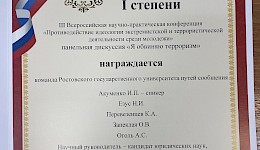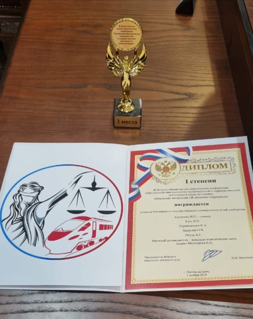 1 ноября 2024 года в Южном окружном военном суде состоялась III Всероссийская научно-практическая конференция «Противодействие идеологии экстремистской и террористической деятельности среди молодежи», в которой под руководством доцента кафедры «Административное право и уголовно- правовые дисциплины» Миллеровой Елены Александровны приняли участие студенты направления подготовки «Юриспруденция» Акуменко Игорь, Перевезенцев Кирилл гр. ПУБ-4-28, Запеклая Ольга гр. ПГБ-4-26, Криворучко Роман, Оголь Ангелина гр. ПГБ-3-29, Езус Никита гр. ПУБ-2-32.