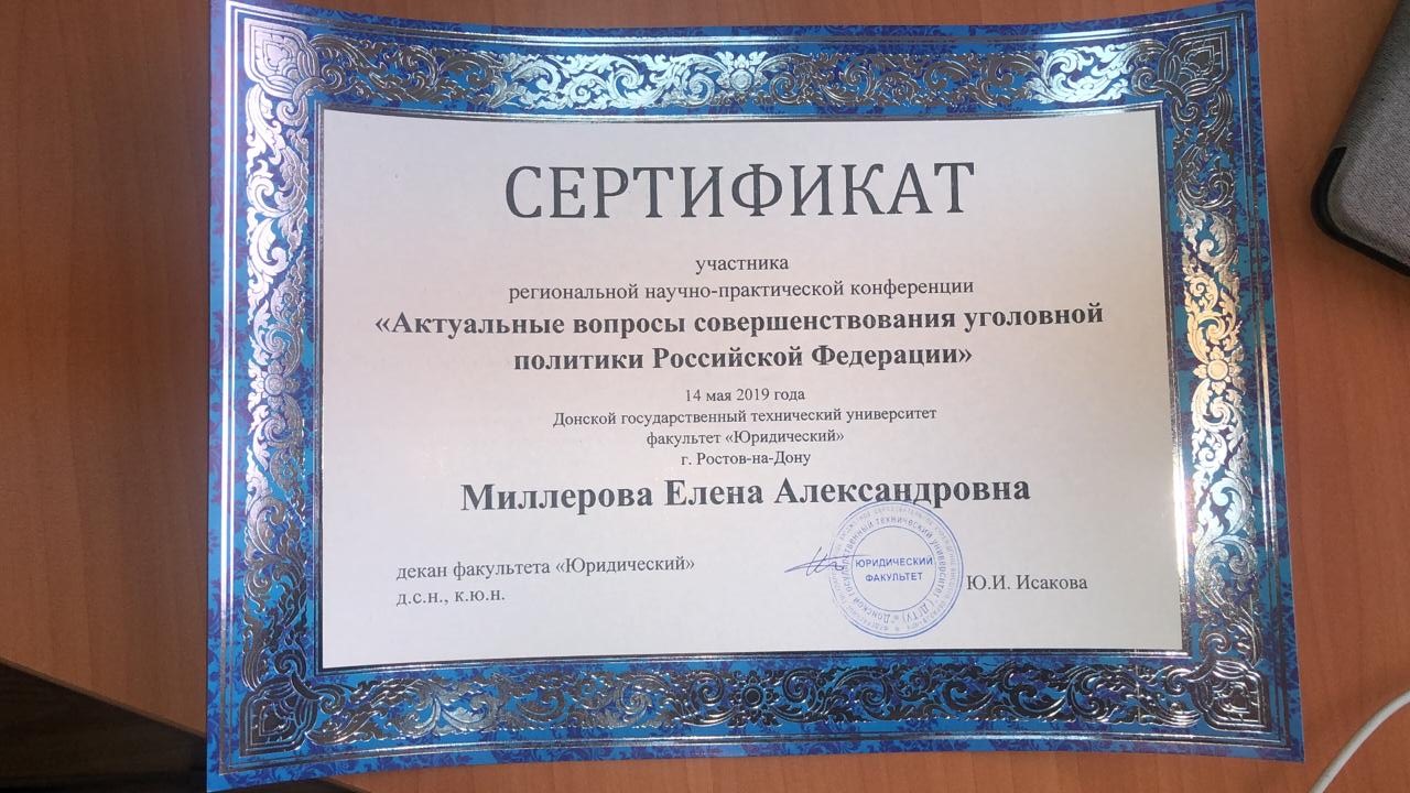 14 мая 2019 г. доценты кафедры «Административное право и уголовно–правовые дисциплины» ФГБОУ ВПО РГУПС, к.ю.н. Р.Е. Затона, к.ю.н.. доцент Е.А. Миллерова, студенты факультета «Экономика, управление и право» гр. ПУБ-3-014 Калмыкова Д.И. и Журавлёва Е.В., гр. ПУБ 4-012 Куксина А.В. приняли участие в региональной научно-практической конференции «Актуальные вопросы совершенствования уголовной политики Российской Федерации, проводимой кафедрой «Уголовное право и криминалистика» факультета «Юридический» ФГБОУ ВПО ДГТУ.